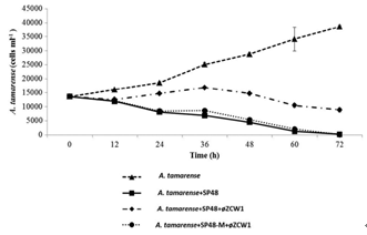 A lytic phage (øZCW1) was isolated from an algicidal bacterium Pseudoalteromonas sp. strain SP48 that specifically kills the toxic dinoflagellate Alexandriumtamarense. We demonstrated that øZCW1 could trigger the growth of A. tamarense by inhibiting the growth of algicidal bacterium SP48. In contrast, the growth of A. tamarense was suppressed when cocultured with either SP48 or the øZCW1-resistant mutant of SP48. This study provides the first evidence of the indirect impact of bacteriophage on bloom-forming microalgae via phage lysis of alga-killing bacteria.