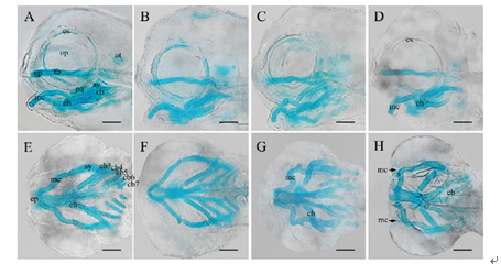 Fig. 2 Exposure to BaP for 7 days resulted in neurocranial and craniofacial skeletal defects inSebastiscus marmoratusembryos. Lateral (A-D) and ventral (E-H) views of head of larvae. Control larvae (A and E) displayed a normal craniofacial skeleton; the 0.05 nmol/L BaP exposure (B and F) showed no adverse effect to skeletal development and several skeletons, such as the circumorbital series and the otic capsule, developed faster than those in the control group. Exposure to 0.5 (C and G) or 5 nmol/L BaP (D and H) led to shortened optic and otic capsules; shortened ceratobranchia and hyoid arches (C and D); and warping of Meckel’s cartilage resulting in a shorter lower jaw (G and H). Abbreviations: ch, ceratohyal; cb3-7, ceratobranchial 3-7 (branchial arches); cs, circumorbital series; ep, ethmoid plate (neurocranium); mc, Meckel’s cartilage (lower jaw); ot, optic capsule; pq, palatoquadrate (upper jaw); sy, symplectic; tb, trabecular (neurocranium). Scale bars are 100µm.