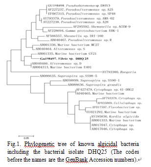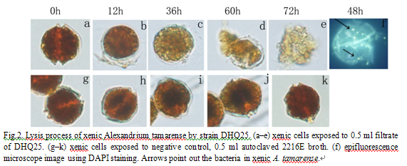 Methods and Results: 16S rDNA sequence analysis showed that the most probable affiliation of DHQ25 belongs to the c-proteobacteria subclass and the genus Vibrio. Bacterial isolate DHQ25 showed algicidal activity through an indirect attack. Xenic culture of A. tamarense was susceptible to the culture filtrate of DHQ25 by algicidal activity assay. Algicidal process demonstrated that the alga cell lysed and cellular substances released under the visual field of microscope. DHQ25 was a challenge controller of A. tamarense by the above characterizations of algicidal activity assay and algicidal process.