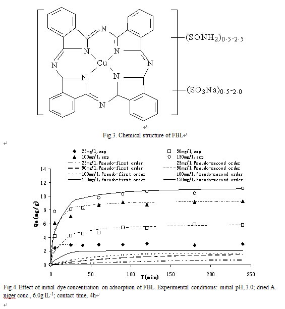 The capacity and mechanism with which nonviable Aspergillus niger removed the textile dye, C.I. Direct Blue 199, from aqueous solution was investigated using different parameters, such as initial dye concentration, pH and temperature. In batch experiments, the biosorption capacity increased with decrease in pH, and the maximum dye uptake capacity of the biosorbent was 29.96mgg−1at 400mgL−1dye concentration and 45℃. The Langmuir and Freundlich models were able to describe the biosorption equilibrium of C.I. Direct Blue 199 onto the fungal biomass. Biosorption followed a pseudo-second order kinetic model with high correlation coefficients (r2 > 0.99). Thermodynamic studies revealed that the biosorption process was successful, spontaneous and endothermic in nature.