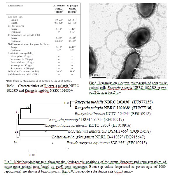 The 16S rRNA genes ofRuegeria pelagiaNBRC 102038TandRuegeria mobilisNBRC 101030Twere resequenced and the results confirmed that they differ by only one base in their almost fulllength sequences (1425 nt). The gyrB gene sequence similarity between the two strains was also high (97.7 %). The outcome of API 20NE, API ZYM and antibiotic susceptibility tests showed that the two strains show only one difference, in b-galactosidase activity, in API tests and five differences in susceptibility among 30 tested antibiotics. In addition, similar BOX-PCR fingerprints were obtained and the DNA–DNA relatedness between the two strains was 91±4%. On the basis of these results, it is concluded that Ruegeria pelagia Lee et al. 2007 is a laterheterotypic synonym of Ruegeria mobilis Muramatsu et al. 2007.