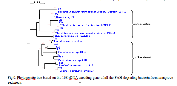 There are abundant PAH-degrading bacteria in mangrove sediments, and it is very important to screen the high efficiency degraders in order to perform bioremediation of PAH polluted environments. In order to obtain the more highly efficient PAH-degrading bacteria from a mangrove swamp, we first obtained 62 strains of PAH-degrading bacteria using traditional culture methods and based on their morphological characteristics. We then used the modern molecular biological technology of PCR–RFLP, in which the 16S rDNA of these strains were digested by different enzymes. Based on differences in the PCR–RFLP profiles, we obtained five strains of phenanthrene-degrading bacteria, five strains of pyrene-degrading bacteria, four strains of fluoranthene-degrading bacteria, five strains of benzo[a]pyrene-degrading bacteria and two strains of mixed PAH-degrading bacteria (including phenanthrene, pyrene, fluoranthene and benzo[a]pyrene). Finally, a total of 14 different PAH-degrading bacteria were obtained. The 16S rDNA sequences of these strains were aligned with the BLAST program on the NCBI website and it was found that they belonged to the α-proteobacteria and γ-proteobacteria, including four strains, where the similarities were no more than 97% and which were suspected therefore to be new species. This study indicated that PCR–RFLP was a very important method to screen degrading-bacteria, and also a significant molecular biological tool for the rapid classification and accurate identification of many different strains. On the other hand, it also showed that rich bacterial resources existed in mangrove areas, and that exploring and developing the functional microorganism from these mangrove areas would have wide use in the study of bioremediation of contaminated environments in the future.