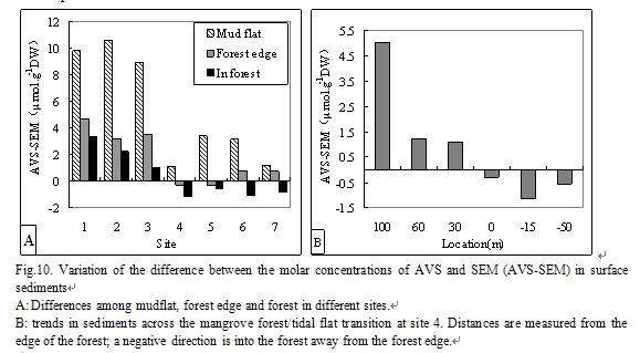 The distribution of acid-volatile sulfide (AVS) and simultaneously extracted metals (SEM) were studied in sediments collected from mangrove forest, forest fringe and adjacent mudflat in the Zhangjiang Estuary, China. The aim was to examine the spatial distribution of AVS and SEM in sediments of the Estuary and determine the influence of mangrove trees on AVS and SEM concentrations in the sediments. The results indicated that AVS concentrations in forest sediments were significantly lower than those in mudflat sediments. There was a significant positive correlation between AVS values and moisture contents in forest sediments, while LOI played an important role in AVS concentrations of mudflat sediments. In the forest sediment core, the peak value of AVS appeared deeper in the sediment profile compared to it appeared in the mudflat core. The distribution of SEM showed different trends from that of AVS, and potential toxicity existed in the upriver forest sediments.