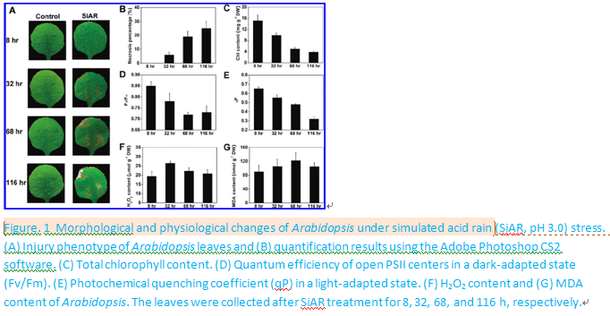 A proteomic study using 2-D gel electrophoresis and MALDI-TOF MS was performed to characterize the responses ofArabidopsis thalianaplants to simulated acid rain (SiAR) stress, which is a global environmental problem and has become a serious issue inChinain recent years. The emphasis of the present study was to investigate the overall protein expression changes when exposed to SiAR. Out of over 1000 protein spots reproducibly resolved, 50 of them changed their abundance by at least 2-fold. Analysis of protein expression patterns revealed that a set of proteins associated with energy production, metabolism, cell rescue, cell defense and protein folding, etc., could play important roles in mediating plant response to SiAR. In addition to this, some proteins involved in stress responses and jasmonic acid pathway are also involved in plant response to SiAR. More interestingly, the expression of several ubiquitination-related proteins changed dramatically after 32-h SiAR treatment, suggesting that they may act as a molecular marker for the injury phenotype caused by SiAR. Based on our results, we proposed a schematic model to explain the mechanisms associated with the systematic response ofArabidopsisplants to SiAR.