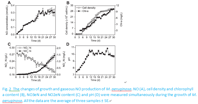 This study characterized the changes of nitric oxide (NO) production during the growth ofMicrocystis aerugrinosa, a cyanobacterium which usually cause cyanobacterial blooms. Results showed a drastic NO release accompanying with cell density and Chl-a content sharp rises whenM. aerugrinosagrew from fifth day to sixth day. Moreover, high N:P ratio accelerated the cyanobacterial growth and NO burst. Sodium nitroprusside, an exogenous NO donor, promotedM. aerugrinosagrowth with the optimal concentration of 0.1 mg/L. Experiments by supplementing with sodium nitrite and L-arginine demonstrated NO production inM. aerugrinosacells was mainly through nitrate reductase (NR) pathway while minorly through NO synthase pathway. All these data suggestedM. aerugrinosaproduced increasing NO during its growth mainly by NR pathway, during which NO positively regulated the growth ofM. aerugrinosa.