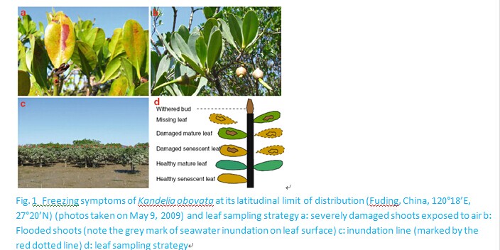 The latitudinal distribution of mangrove species is limited mainly by low temperature. Leaf scorch and massive leaf fall are the predominant symptoms of frost damage. Nutrient resorption during leaf senescence is an important adaptation mechanism of mangroves. Abnormal defoliation disturbs nutrient resorption. We evaluated the effects of frost on nutrient loss of mangroves and the protective effects of warmer seawater inundation on reducing nutrient loss. On January 14, 2009, the most cold-tolerant mangroveKandelia obovataat its naturally latitudinal limit (Fuding, China, 27°17’N) was exposed to freezing temperature (−2.4°C) for 4 h (minimum −2.8°C). The freezing air temperature occurred during flood tide, resulting that the flooded shoots were protected by warmer seawater. Frost caused 31.3% and 13.0% defoliation on the exposed shoots and the flooded shoots, respectively. Frost restricted nutrient resorption during leaf senescence.K. obovataresorbed 61% N and 42% P during normal leaf senescence, respectively. However, frost-damaged leaves only resorbed 13% N and 10% P during the course, respectively. Foliar N:P molar ratios were <31 , suggesting n limitation. tidal inundation can partially protect mangroves from frost damage. reduced nutrient resorption efficiency and massive leaf fall caused by frost add pressure to mangroves under nutrient limitation at their latitudinal limits.