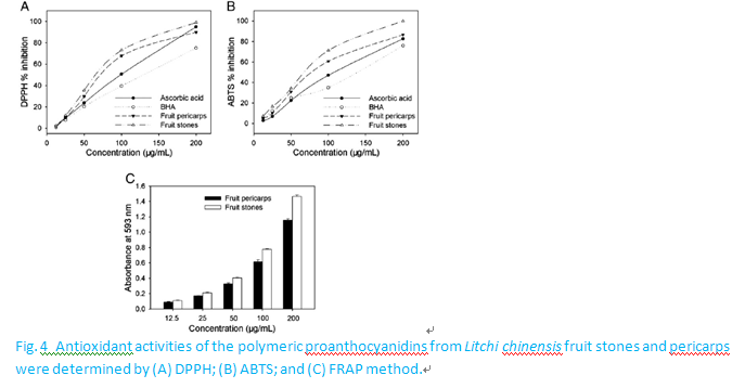 Fruit stones and pericarps ofLitchi chinensis, waste products of the food, were studied as a source of polymeric proanthocyanidins. The structures of the polymeric proanthocyanidins isolated fromLitchi chinensiswere characterized by matrix-assisted laser desorption/ionization time-of-flight mass spectrometry (MALDI-TOF MS) coupled with high performance liquid chromatography electrospray ionization mass spectrometry (HPLC-ESI-MS) analysis. The spectra obtained through MALDI-TOFMS analysis revealed that the dominant Atype procyanidin polymers occurred in each polymer length with one or more A-type linkages. The polymeric proanthocyanidins of litchi fruit stones exhibited longer polymer length than those of fruit pericarps, with polymerization degrees up to 20 and 11 for fruit stones and pericarps, respectively. After depolymerization with toluene-α-thiol, HPLC-ESI-MS analysis showed that epicatechin and A-type dimer were the major constituent units, and the mean polymerization degrees were 15.4 and 5.8 for polymeric proanthocyanidins of fruit stones and pericarps, respectively. The antioxidant properties investigated using DPPH, ABTS and FRAP methods showed that the higher polymerization degree of polymeric proanthocyanidins from litchi fruit stones exhibited higher antioxidant activities than those from litchi pericarps.