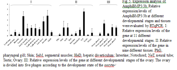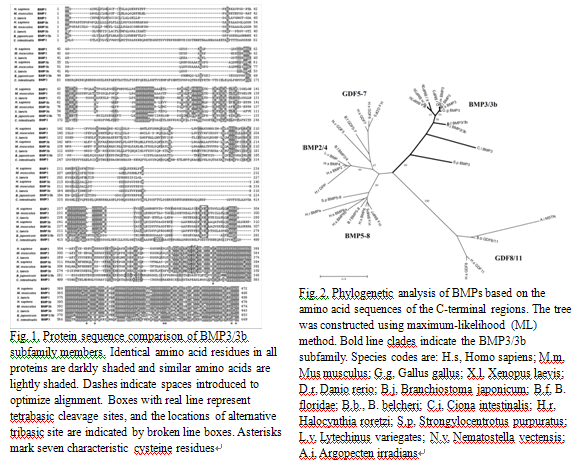 Bonemorphogenetic proteins (BMPs) are responsible for regulating embryo development and tissue homeostasis beyond osteogenesis. However, the precise biological roles ofBMP3andBMP3bremain obscure to a certain extent. In this study, we cloned an orthologous gene (AmphiBMP3/3b) from amphioxus (Branchiostoma japonicum) and found its exon/intron organization is highly conserved. Further,in situhybridization revealed that the gene was strongly expressed in the dorsal neural plate of the embryos. The gene also appeared in Hatschek's left diverticulum, neural tube, preoral ciliated pit and gill slit of larvae, and adult tissues including ovary, neural tube and notochordal sheath. Additionally, real-time quantitative PCR (RTqPCR) analysis revealedthat the expression displayed two peaks at gastrula and juvenile stages. These results indicatedthatAmphiBMP3/3b, a sole ortholog of vertebrateBMP3andBMP3b, might antagonize ventralizingBMP2orthologous signaling in embryonic development, play a role in the evolutionary precursors of adenohypophysis, as well as act in female ovary physiology in adult.