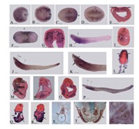 Fig. 4. Developmental expression of AmphiBMP3/3b in the embryo, early larva and adult. In the whole mounts, anterior is on the left; the cross sections are counterstained with pink and viewed from the posterior end of the animal. Scale bars = 50 μm in A–D, F, H, J, K and P; 25μm in E, G, I, L-O, Q and R; 250 μm in S, T and 100 μm in U. (A) Side view of the whole mount of midgastrula (4 hours post-fertilization) with AmphiBMP3/3b expression in the invaginated hypoblast (arrow). (B) Side view of the whole mount of late gastrula (6 hours post-fertilization) with expression throughout the endoderm (double arrow) and in the blastoporal lip (arrows) conspicuously. (C, D) Dorsal view of whole mount of early neurula (7 hours post-fertilization). The expression level is strongest at the neural plate (arrows). (E) Cross section through level e in (D). Transcript is visible at the neural plate (double arrows) and the dorsal mesoderm (arrows). (F) Dorsal view of middle neurula (10 hours post-fertilization). Arrows indicate the expression in the somites. (G) Cross sections through levels g in (F). Arrows indicate the expression in the somites and arrowheads indicate the expression in the neural plate. (H) Side view of early larva in which the mouth has just opened (35 hours post-fertilization). AmphiBMP3/3b is expressed in the pharynx (arrow). (I) Cross section through level i in (H). Arrow indicates the Hatschek's left diverticulum and double arrow indicates the neural tube. (J) Side view of 3-gill-slit larva (6 days post-fertilization) showing the expression in the anterior ectoderm, cerebral vesicle, preoral ciliated pit, club-shaped gland, gill slit, lateral and ventral mesoderm, anterior neural tube and posterior end of the tail. (K) Anterior enlargement of preceding specimen showing transcripts in the cerebral vesicle (arrowhead), preoral ciliated pit (arrow), club-shaped gland (double arrow) and gill slit (asterisk). (L-O) Cross sections through levels l, m, n and o in (J). Arrows indicate the anterior ectoderm in (L), cerebral vesicle in (M), club-shaped gland in (N) and lateral mesoderm in (O). Arrowheads indicate the preoral ciliated pit in (M), endostyle in (N) and neural tube in (O). Double arrows indicate the neural tube in (N) and ventral mesoderm in (O). Asterisk indicates incipient pharyngeal slit in (O). (P) Side view of late larva (33 days post-fertilization) showing the expression in the mouth and ectoderm surrounding the gill slits. (Q, R) Cross sections through levels q and r in (P). Arrows indicate the ectoderm in (Q) and (R). Double arrow indicates the mouth in (Q). (S, T) Expression patterns of AmphiBMP3/3b in adult tissues. Transcripts are visible in the nerve cord, sheath surrounding the notochord (S), metapleural fold and ovary (T). Arrows indicate the sheath surrounding the notochord in (S) and the metapleural fold in (T). Asterisk indicates the ovary in (T). (U) Cross section of ovary. The gene is expressed in oocytes (asterisk). Arrow indicates follicular cells. Abbreviations: bp, blastopore; n, notochord; nc, neural cord; ps, pigment spot.