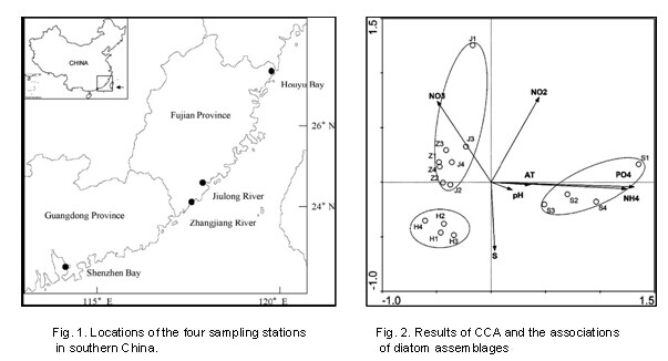Geographical and seasonal patterns of epiphytic diatoms on a subtropical mangrove (Kandelia candel (L.) Druce) were examined at four sites in southern China. A total of one hundred and three epiphytic diatom species and varieties belonging to 40 genera were identified. Dominant species included Nitzschia fasciculata, Luticola mutica and Achnanthes javanica var. subcontricta. Further analysis using canonical correspondence analysis revealed three diatom associations which could be closely related to environmental variables such as salinity and nutrients resources of nitrogen and phosphate. Epiphytic diatom assemblages on roots would be a good indicator for the evaluation of water quality inmangroves.