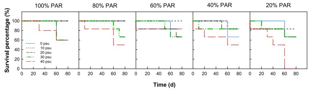 Figure 1. Survival percentages of Laguncularia racemosa seedlings grown under five light levels (100%, 80%, 60%, 40%, and 20% PAR) and five salinity treatments (0, 10, 20, 30, and 40 psu) during the 90-day greenhouse experiment.