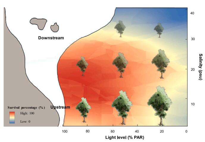 Figure 2. Kriging method was used to predict the dispersal habitat of L. racemosa seedlings in the estuary area using the greenhouse data on survival rates for L. racemosa seedlings grown under different light and salinity treatments. The size of the tree indicates the height of the mature tree and the tree transparency indicates the possibility of survival. The red and blue zones indicate the highest and lowest percentages for seedling survival, respectively. (For interpretation of the references to colour in this fgure legend, the reader is referred to the web version of this article.)