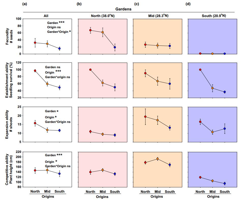 Figure 1. Performance of Spartina alterniflora in gardens reciprocally transplanted at different latitudes in the invasive range. The plant phenotypes are averaged over three gardens (a) and calculated for the northern (b), mid-latitude (c) and southern garden (d). Red, orange, and blue circles indicate the population means (±SE) of two northern, four mid-latitude and three southern invasive populations. [Colour figure can be viewed at wileyonlinelibrary.com]