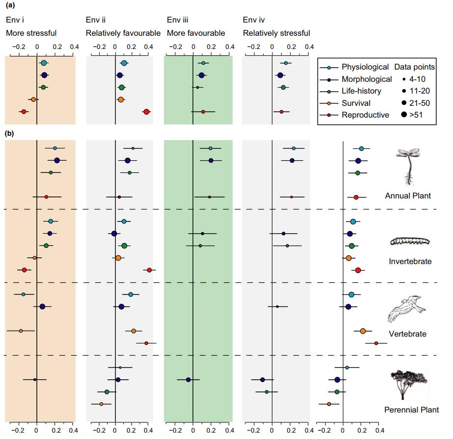 Figure 1. The variation of transgenerational effects among environmental contexts and traits (a) and such variation shown for each taxonomic/life-history group (b). The error bars indicate the 95% confidence intervals of the effect sizes.