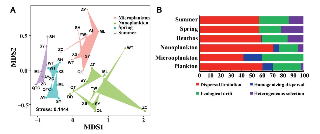 Figure 1. Distribution pattern and assembly mechanism of microeukaryotes in intertidal zones. Non-metric multidimensional scaling (NMDS) of intertidal microeukaryote communities based on Bray-Curtis distance (A). Quantifcation of ecological processes shaping microeukaryotes in intertidal zones (B). Microplankton and Nanoplankton represent size-fractionated water samples, while Spring and Summer represent sediment sampled in spring and summer, respectively; Plankton includes Microplankton and Nanoplankton, while Benthos includes samples collected in both Spring and Summer.