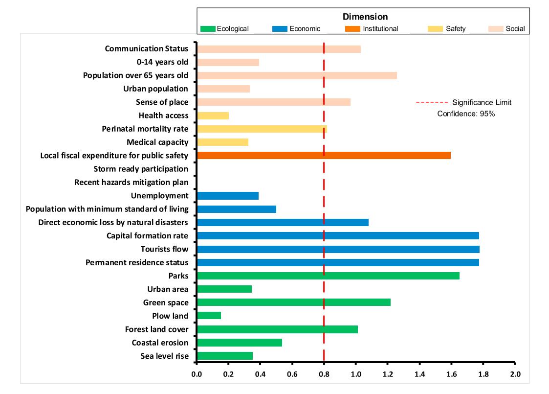 Figure 2. Variable importance (Very Important Variable Index) to form overall resilience score as calculated by PLS regression. The indicator scores are quantified using simple arithmetic mean of the scores of all hotspot regions. The importance of variables is determined by regression coefficients. If the regression coefficient for a variable is smaller than a significant limit (in our case it is 0.8), then there is a small contribution (insignificant) from that variable to form the overall resilience score.