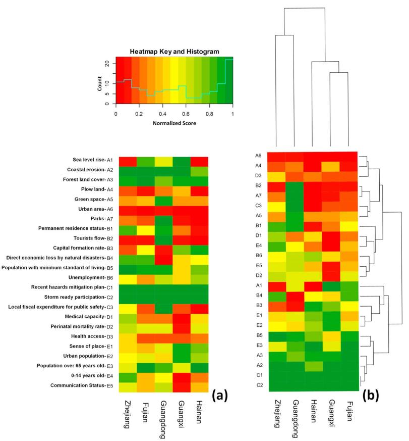 Figure 1. Heat maps representing the individual indicator score for each hotspot region to form the community resilience within the HS: (a) the original results from the model and (b) the results after applying a clustering method using Euclidean distance to find the similarity between the score of different indicators of the HS. The red color represents the lower score (likelihood of the system to be less resilient against landfalling typhoons) achieved by the regions, and green color represents higher scores achieved by the regions (likelihood of the system to be more resilient against hazards). The dendrograms [in (b)] represent the distance/dissimilarity between clusters. Note that the scores are normalized using min-max scaling method. The data used here is for the year 2015 except the D2 variable for which we use data from 2013.