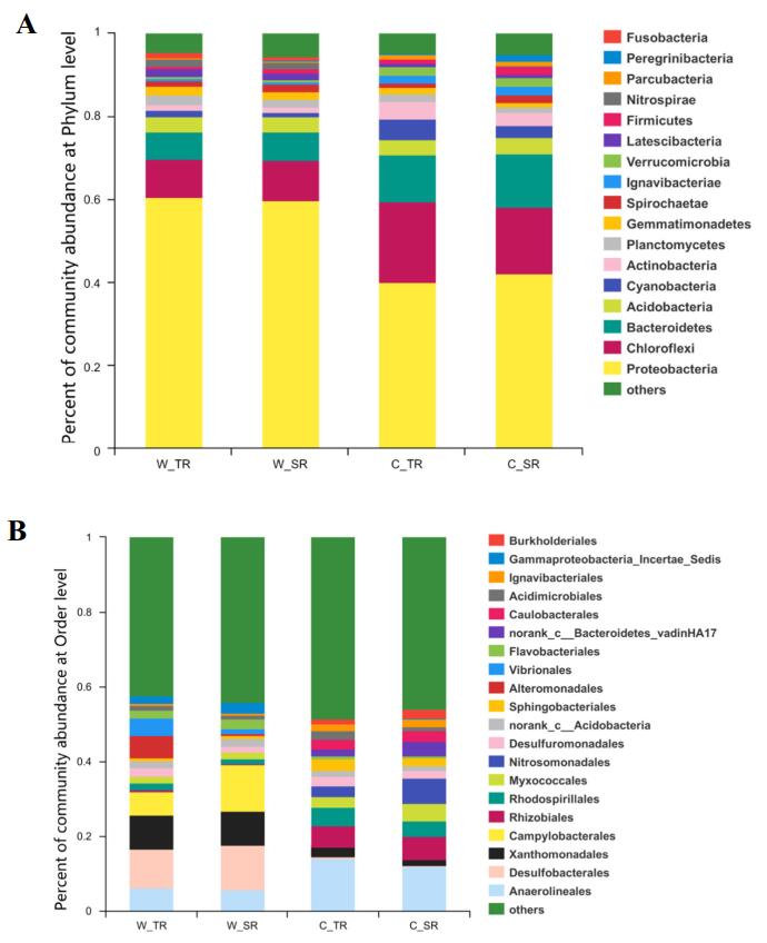 Figure 1. Community bar plot at phylum level (a) and at order level (b). W_TR tall-form Spartina alterniflora rhizosphere sediment samples taken from the field conditions, W_SR shortform Spartina alterniflora rhizosphere sediment samples taken from the field conditions, C_TR tall-form Spartina alterniflora rhizosphere soil samples taken from the common garden with fertilizer addition, C_SR short-form Spartina alterniflora rhizosphere soil samples taken from the common garden with fertilizer addition.