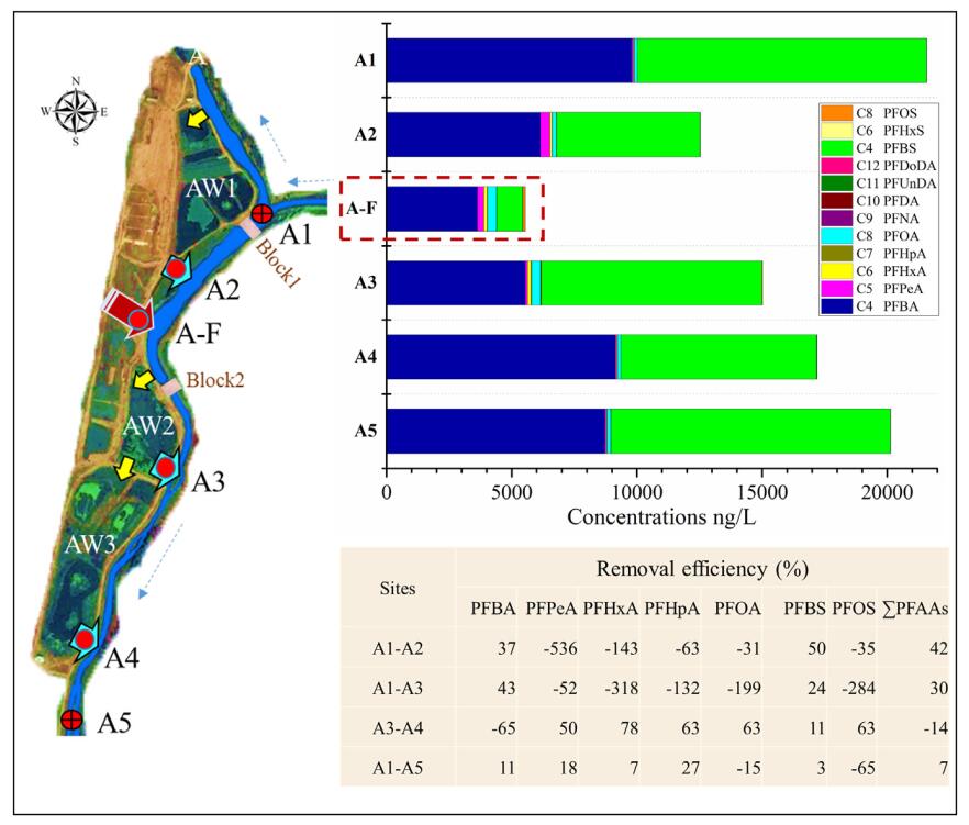Figure 1. PFAAs concentrations (ng/L) and removal efficiency (%) from the processes of the wetland.