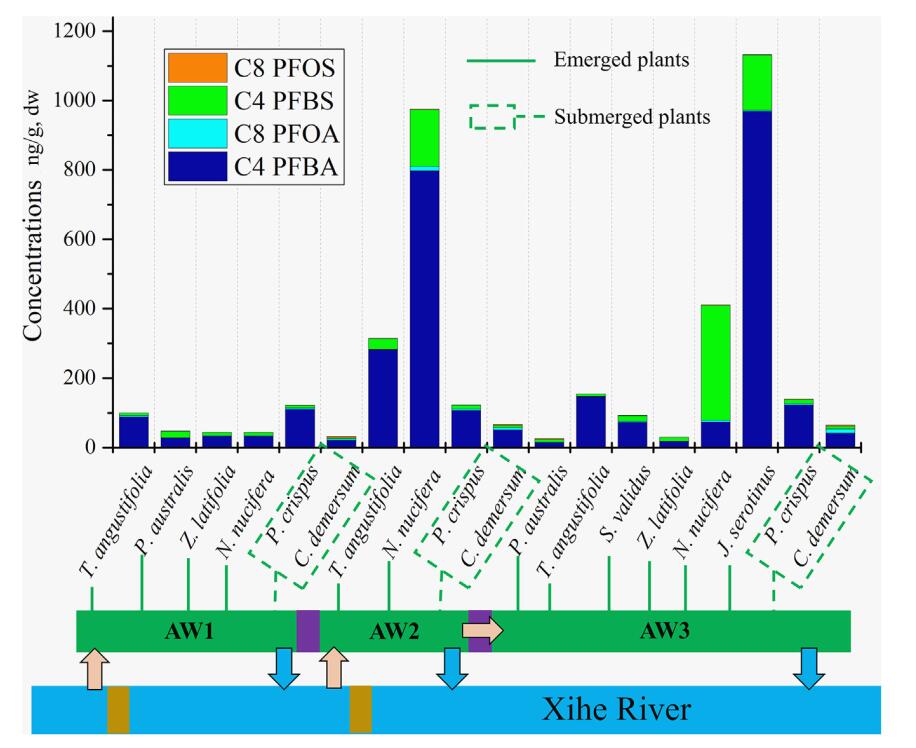 Figure 2. Concentrations of the dominant PFAAs (ng/g, dw) in sequential emerged plants in the wetland (The two species of submerged plants were distributed all over the wetland).