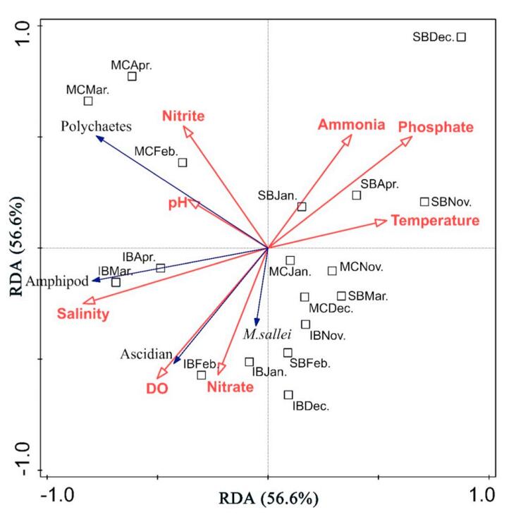 Figure 1. Redundancy analysis (RDA) of macrofouling organisms and environmental variables in different sites and months (MC: main canal, IB: inner bay, SB: Songbai Lake).