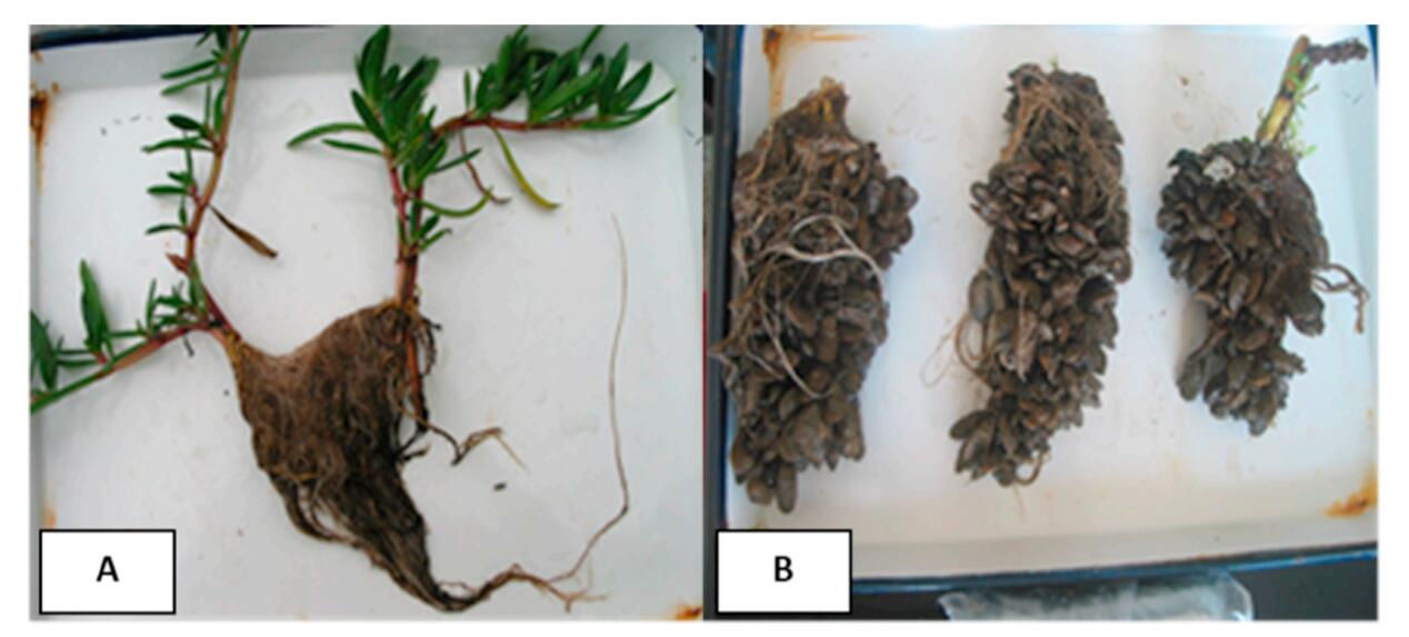 Figure 2. Influence of Mytilopsis sallei on the growth of plant roots. A-roots without macrofouling organisms; B-roots attached with high density of bivalves Mytilopsis sallei.