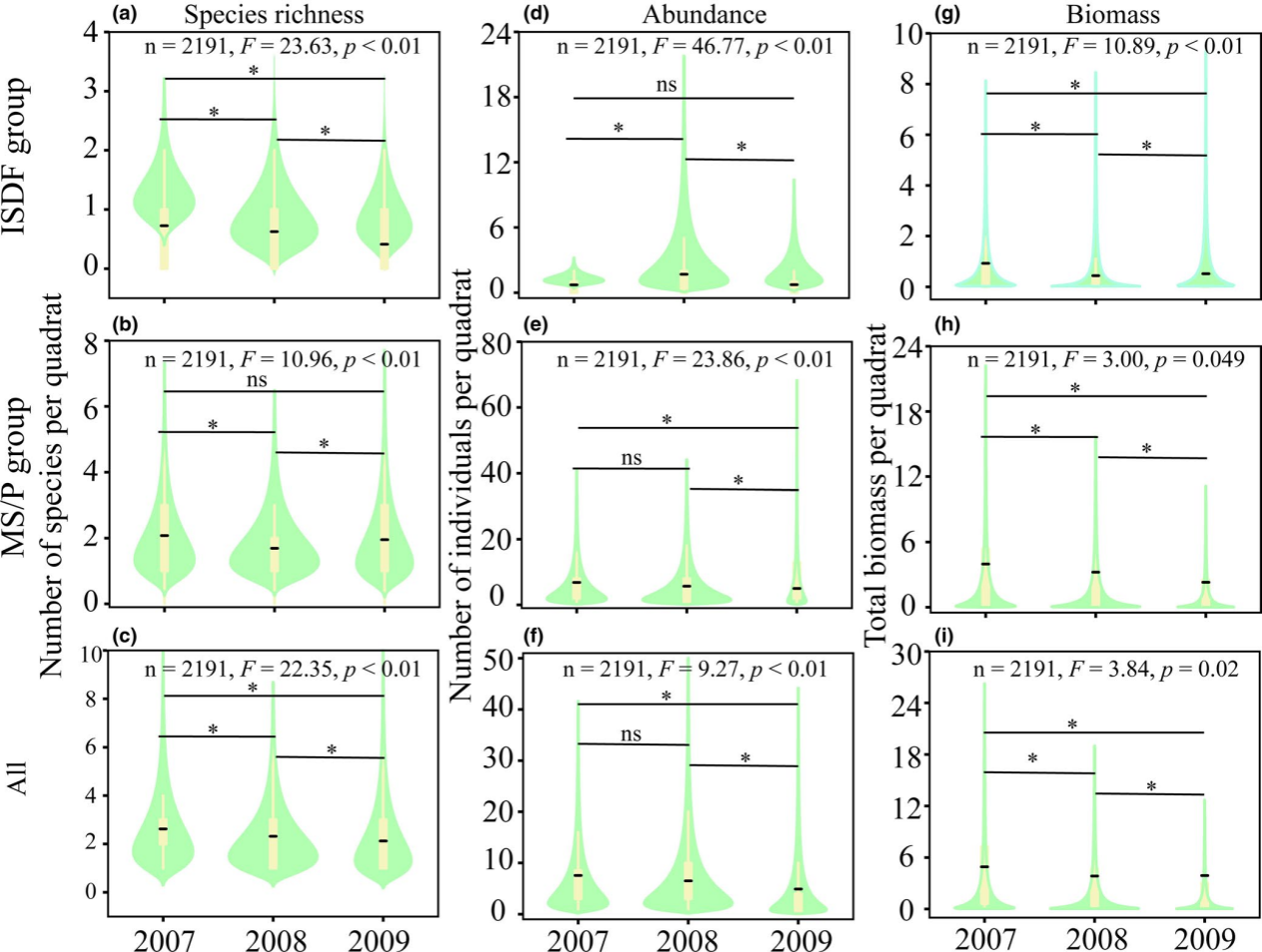 Figure 1. The species richness (a, b, c), abundance (d, e, f) and biomass (g, h, i) of the mollusc communities before (2007) and after (2008 and 2009) an extreme cold event (ECE). The “n” indicates the number of samples. p < 0.05 was the significance level in the one-way analysis of variance (ANOVA). “ISDF” indicates the in-faunal shelled deposit feeders, “MS/P” reflects the hard-bodied, mobile scavenger/predators and “All” means the total mollusc community. “*” indicates p < 0.05 and that it passed αo = 0.05 (<0.017) in the Bonferroni test, “ns” indicates p > 0.05 and that it did not pass the level of αo = 0.05 (>0.017) in the Bonferroni test.