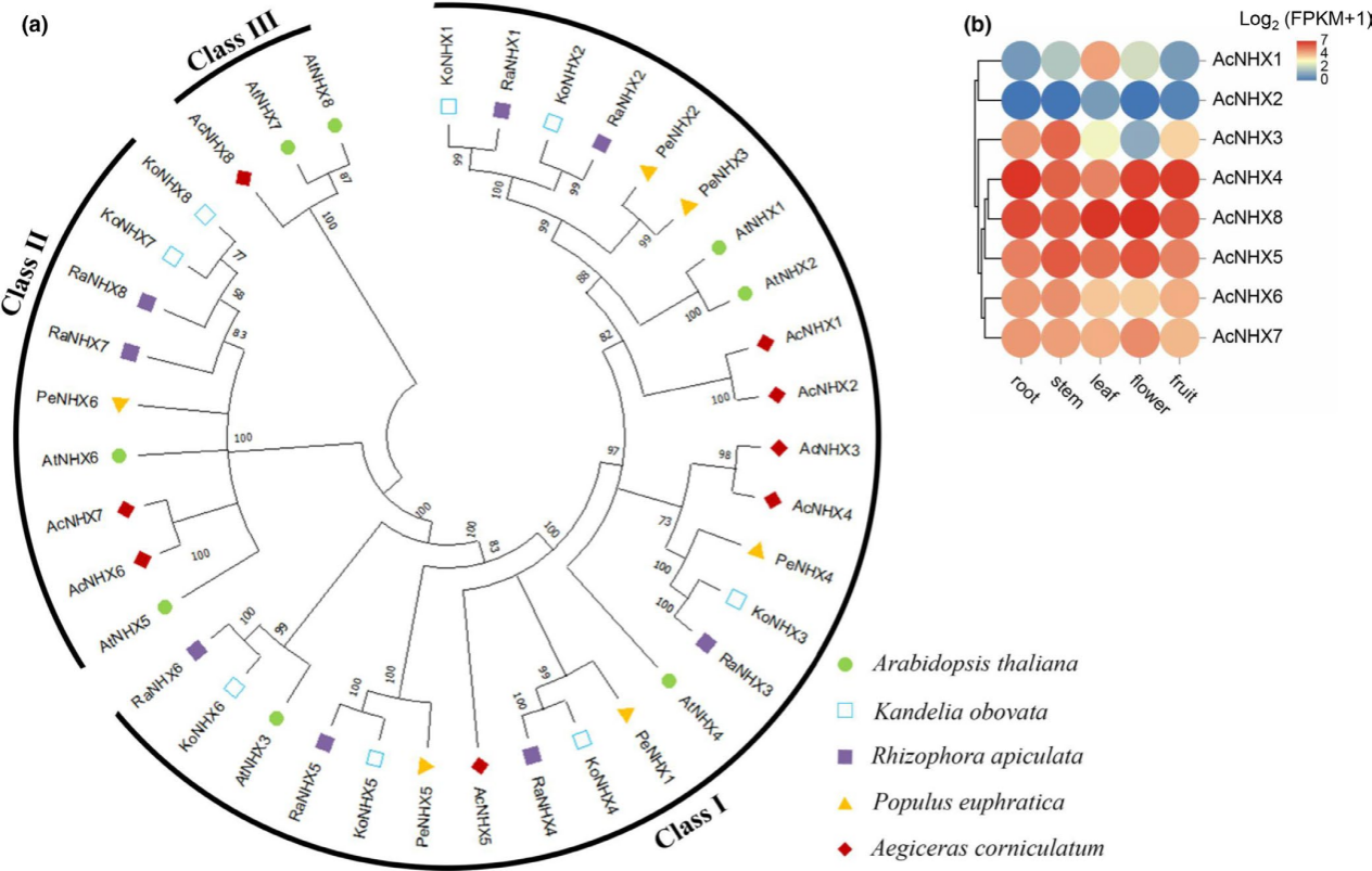 Figure 1. Analysis of NHX gene family. (a) Phylogenetic analysis of NHX genes from Arabidopsis thaliana (At), Kandelia obovata (Ko), Rhizophora apiculata (Ra), Populus euphratica (Pe), and A. corniculatum (Ac). There are three main categories: Class I, Class II and Class III (b) Heatmap showing the expression pattern of AcNHX genes in different tissues including root, stem, leaf, flower and fruit.