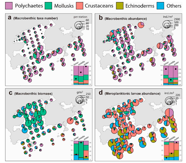 Figure 1. Macrobenthic taxa number (a), abundance (b), biomass (c) and meroplanktonic larvae abundance (d) composition in Daya Bay. Pie graph diameter is proportional to the value. Bar plot at the bottom right of each panel shows the contributions of different macrotaxa groups with the mean values averaged by the inner, middle and outer sector.