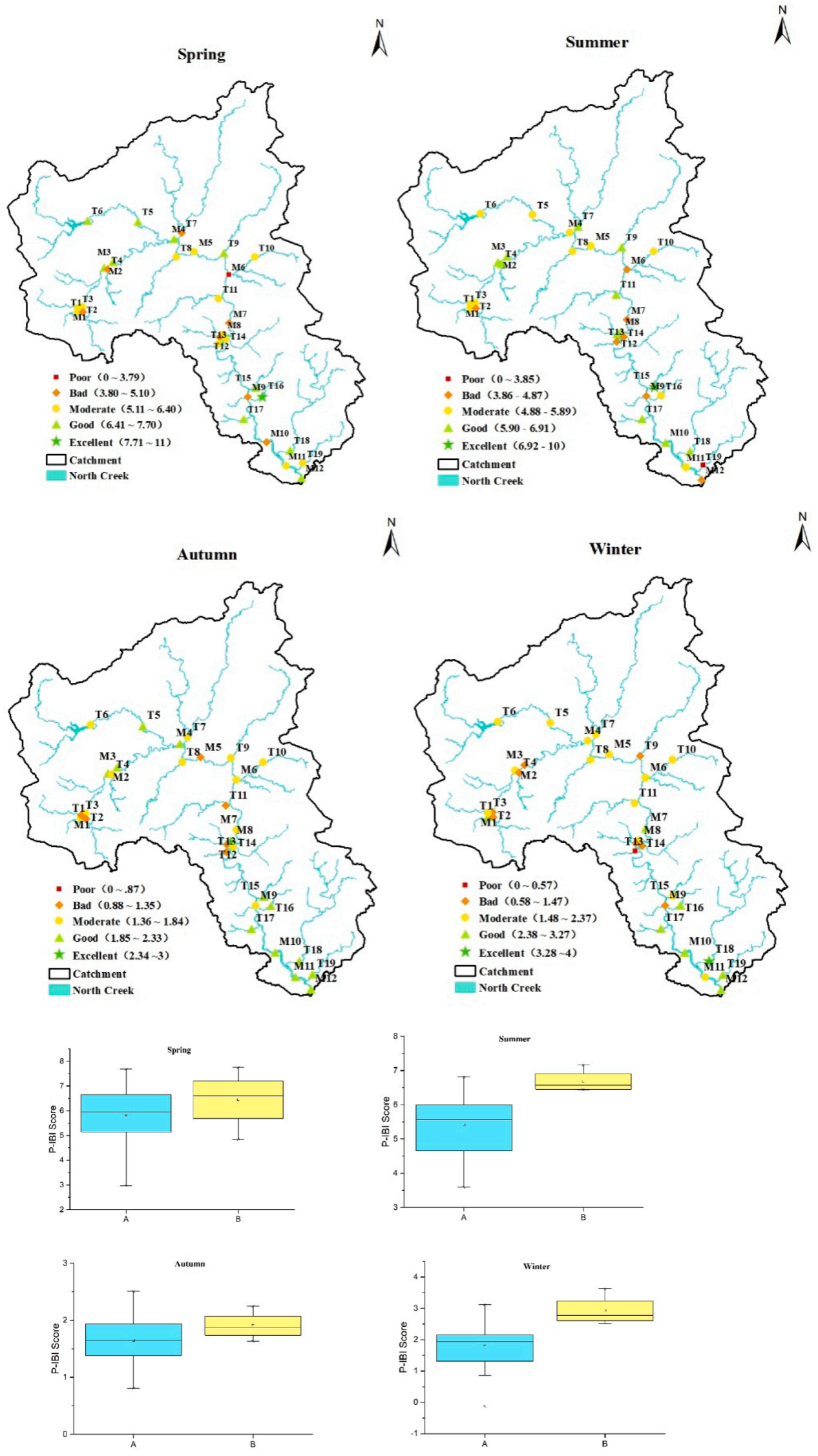 Figure 1. P-IBI ecosystem health assessments for waters in the North Creek across four seasons, where A indicates the impaired site and B, the reference site.