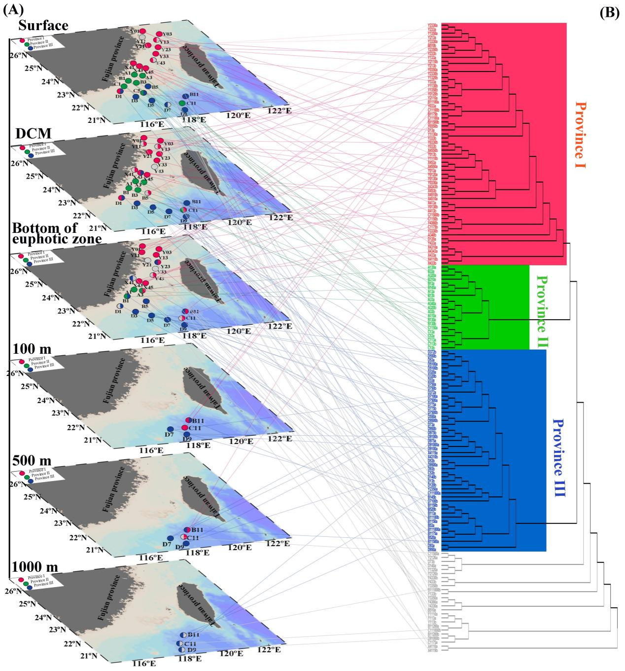 Figure 1. (A) Map of Taiwan Strait highlighting the sampling sites and the distribution of water masses across depth strata in the present study; (B) five water masses identified based on properties of temperature and salinity. The lines across the panel B represent isodensity. Orange dots represent Coastal Diluted Water Mass (CDWM); blue dots represent South China Sea Water Mass (SCSWM); red dots represent Subsurface Kuroshio Branch Water Mass (SKBWM); green dots represent Upwelling Water Mass (UWM); purple ones represent Deep Water Mass (DWM).