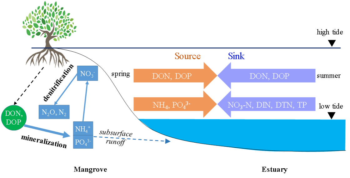 Figure 1. Conceptual schematic of tidal driven nutrients exchange between mangrove and estuary showing a dynamic source-sink pattern.