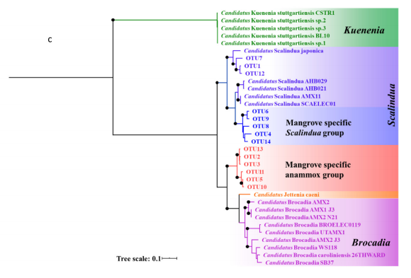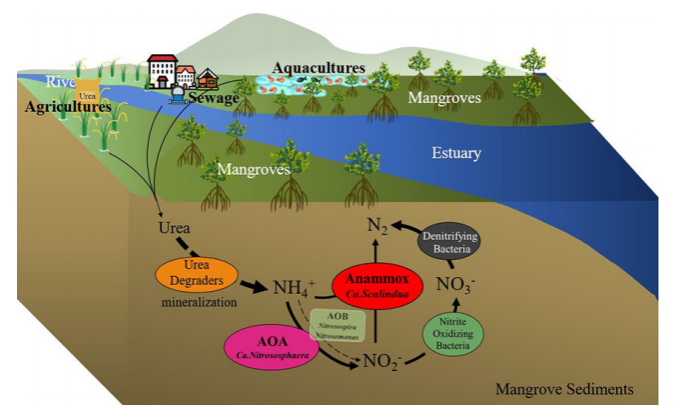 Figure 1. Mangroves harbour specific ammonia oxidizing archaea/bacteria and anammoxbacteria. Habitat specific archaea rather than bacteria contribute to nitrification in mangrove. mRNA abundance of N-transforming microbes effectively indicates metabolic activity. Nitrification (primarily by AOA)-denitrification contributes to anthro pogenic N removal.