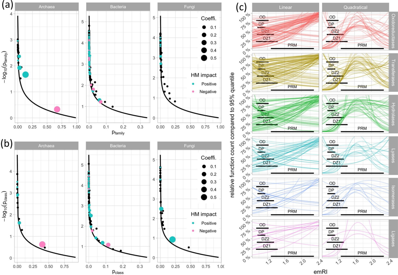 Figure 1. (a) Rare families and (b) classes, as opposed to dominant ones, determined the microbial diversity under the influence of trace metals. Dots and curves depict the relationship between the mean contribution to the Shannon index (-log10(pi)) and mean relative abundance in Archaea, Bacteria, and Fungi kingdom. Cyan and pink points represent classes that positively or negatively related to the emRI and the size of points represent the trace metal effect as coefficient of GLM. (c) The overlapping relative performance of microbial function, as predicted by PICRUSt2 and normalized using 95% quantiles, might support the increase of prokaryotic diversity. Curves represent significant predictions of functional features. Black bars represent the variation (mean ± SD) of emRI in each region.