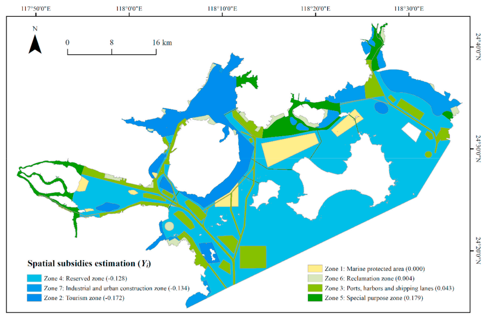 Figure 1. Spatial subsidy between different marine functional zones. A positive (or negative) Yi value indicates that the sea area in zone i provides more (or less) support for dolphin occurrence than the marine functional zone m (marine protected area here).
