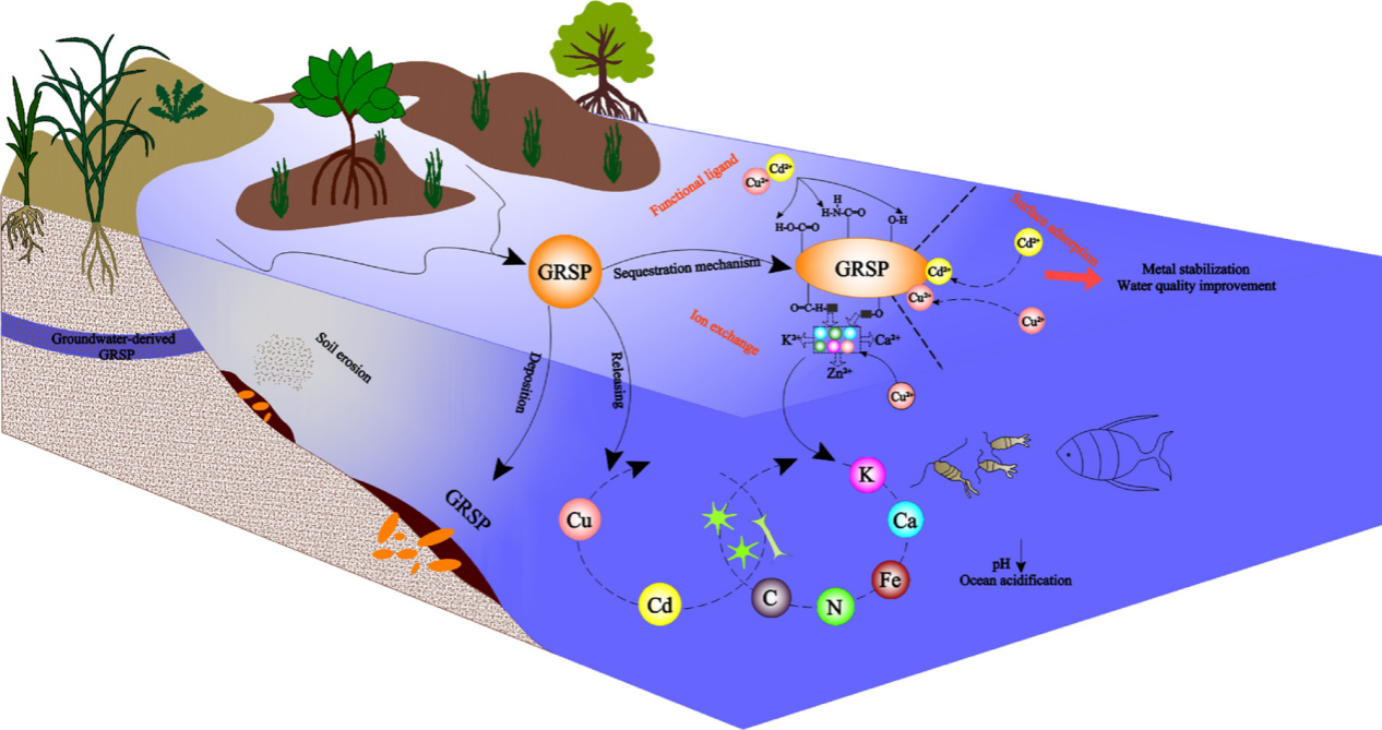 | Figure 1. GRSP fraction promoted water quality improvement and bioremediation of heavy metals in the aquatic environment. It enters coastal water via rivers through erosion and sequestered heavy metals primarily through the process of ion exchange and functional group ligands.