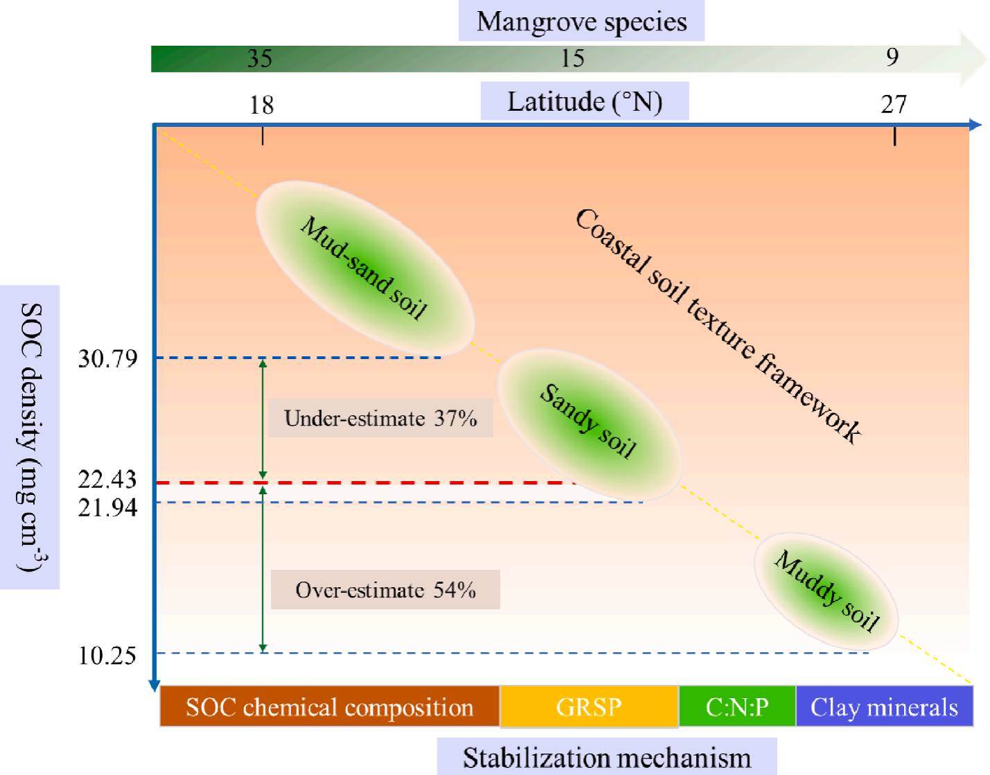Figure 1. The coastal soil texture framework offers an alternative standpoint to the latitude- and species-based framework proposed to explain the spatial variation in SOC storage. Red and blue dashed lines indicate the SOC density of the total average and distinct soil textures, respectively. The sizes of the ellipses are proportional to the mangrove area for each soil texture, indicating the mangrove blue carbon hotspots. The SOC stability in distinct coastal soil textures, as regulated by the chemical composition of SOC, C:N:P stoichiometry, clay minerals and stubborn structure of GRSP, determines the mangrove SOC storage.