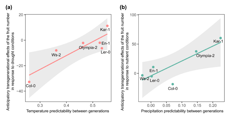 This figure illustrates the significant results of weighted regressions in Table 2. The regression was applied to the fruit number, because it was the only trait shown a significant genotypic variation of transgenerational response (significant G × P.E. in Table 1). Regression results between climate predictability between generations (= temporal autocorrelation of annual mean temperature/precipitation) and genotype-specific anticipatory transgenerational plasticity of drought response (a) and nutrient response (b). Filled orange circles indicate genotype-specific anticipatory transgenerational plasticity of drought response. Filled green circles indicate genotype-specific anticipatory transgenerational plasticity of nutrient response. Grey belts show the 95% confidence interval of the regression analysis