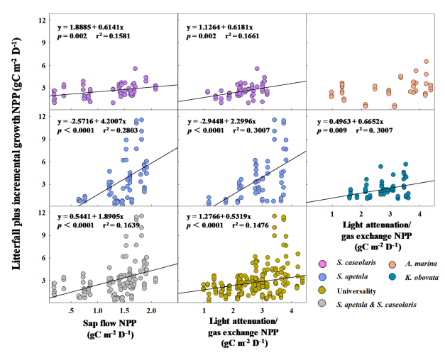 Mangrove forests are among the highest carbon (C) sinks in the tropics and subtropics worldwide. Net primary productivity (NPP) is estimated by the permanent plot method with litterfall plus incremental growth (LG) and has great significance for the evaluation of the carbon sequestration capacity of forests. Here, we developed a new high-resolution method, sap flow investigation (SF), for the evaluation of carbon sequestration capacity. We also compared the forest carbon sequestration capacity estimated using two NPP estimation methods, stand water use using SF and light attenuation/gas exchange (LA), with traditional permanent plots using the LG method in four typical mangrove forests in the Futian Mangrove Reserve of Shenzhen City, China. The LG results showed that mangrove forests had NPPs ranging from 7.67 to 11.87 Mg C ha−1 yr−1 , with species-specific differences. Among the three methods, the LG method is the most widely used, although it is costly and difficult to implement in the field. The LA results showed seasonal variation of NPP, with 4.69 g C m−2 d-1 in summer and 2.02 g C m−2 d-1 in winter. The LA method is relatively simple, but it requires a homogeneous canopy structure with a simple canopy extinction coefficient, which is suitable for mangroves with homogenous canopy structures. Although costly, the most convenient and efficient method is the SF method, which can realize continuous and high-precision dynamic NPP monitoring at the stand scale. After standardization by the LG method, the two highresolution NPP methods could be used in mangrove forests with different time scales. For the global scale, after modification by the correction method provided in our study, the error caused by the determination method could be eliminated, which could make the global database more plentiful and accurate.