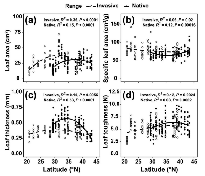 Relationships between latitude and leaf area (a), specific leaf area (b), leaf thickness (c), and leaf toughness (d). Open circles represent Spartina alterniflora in the invasive range (China) and dots represent S. alterniflora in the native range (the United States).
