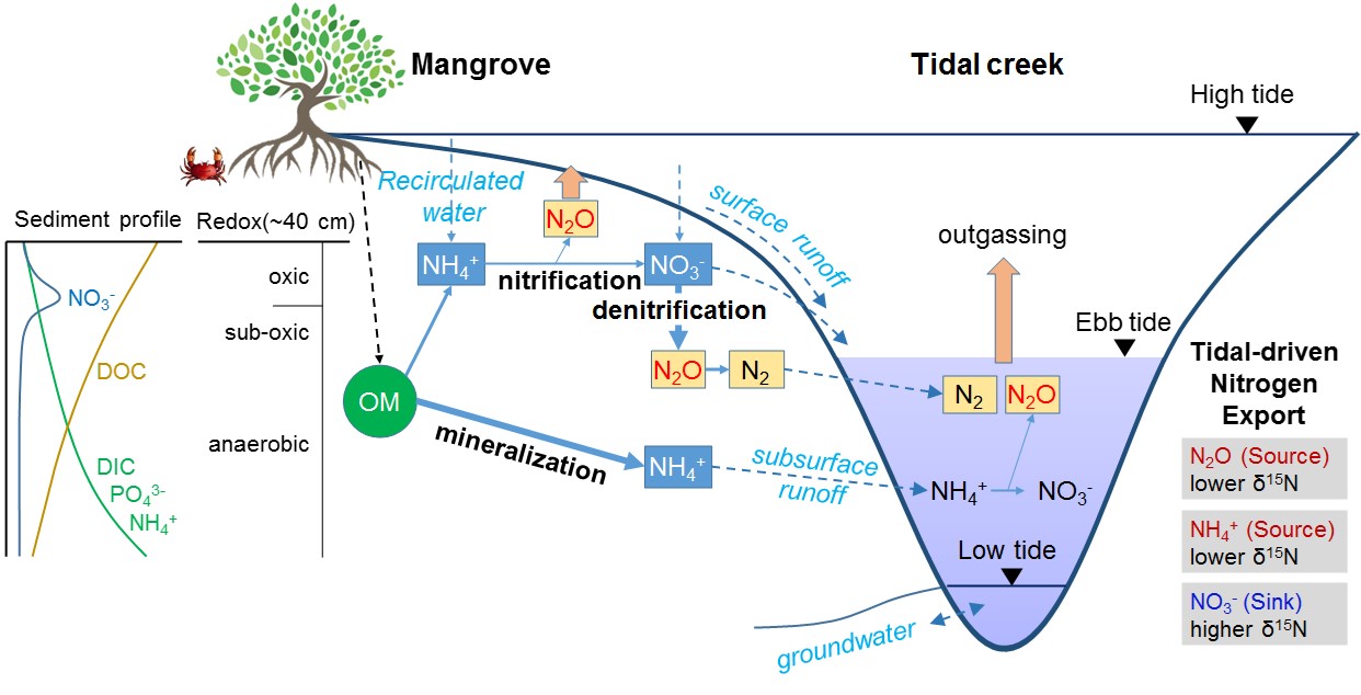 红树林作为陆海界面重要的湿地生态系统,可为人类提供多种生态系统产品与服务,包括营养盐循环、水质净化和碳的埋藏与储存(蓝碳)。红树林沉积物是地球圈层的中心,与水圈、大气圈和生物圈有强烈的相互作用与反馈。然而,控制红树林与邻近河口之间营养盐交换的界面过程与宏微观机制仍不清楚。本研究以福建省漳江口红树林为研究对象,2016年起,项目组通过季节性大面观测、潮周期定点观测、沉积物剖面观测,并结合氮氧碳同位素、氮功能菌等多学科指标的系统分析,探明潮汐控制下的红树林-河口之间氮素交换规律以及沉积物中氮循环与横向输出的主控过程,总结红树林-河口系统氮的源汇格局及其调控因子。研究发现:(1)红树林沉积物是氨氮的源、硝氮的汇。红树林沉积物富碳、还原性强,氨化与强反硝化是关键过程;(2)反硝化过程是沉积物中硝氮去除的重要路径,此过程中伴随着N2的产生和温室气体N2O的排放;(3)整体上,红树林相对河口在春季和冬季是无机氮的源,在夏季和秋季是无机氮的汇。初步揭示微生物(氮功能菌)驱动与潮汐泵(潮差大小)是红树林沉积物氮的转化与横向输出的重要调控机制。该研究区分了不同形态无机氮(氨氮和硝氮)在源汇关系和主控过程方面的差异,提升了对红树林湿地氮循环及其对河口生态环境影响的科学认知。这些科学发现可为实施陆海统筹战略、海岸带生态环境保护和修复提供参考。