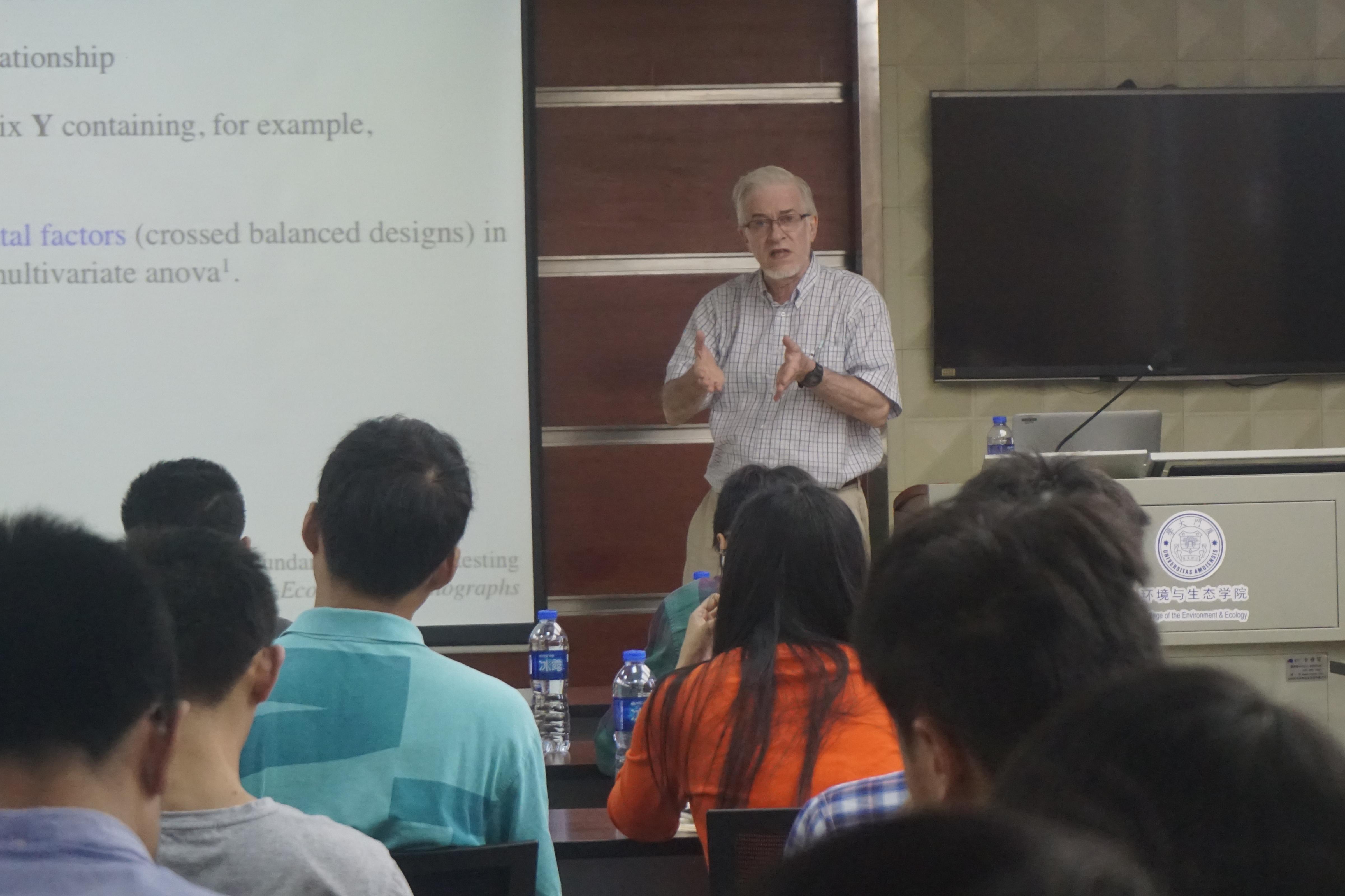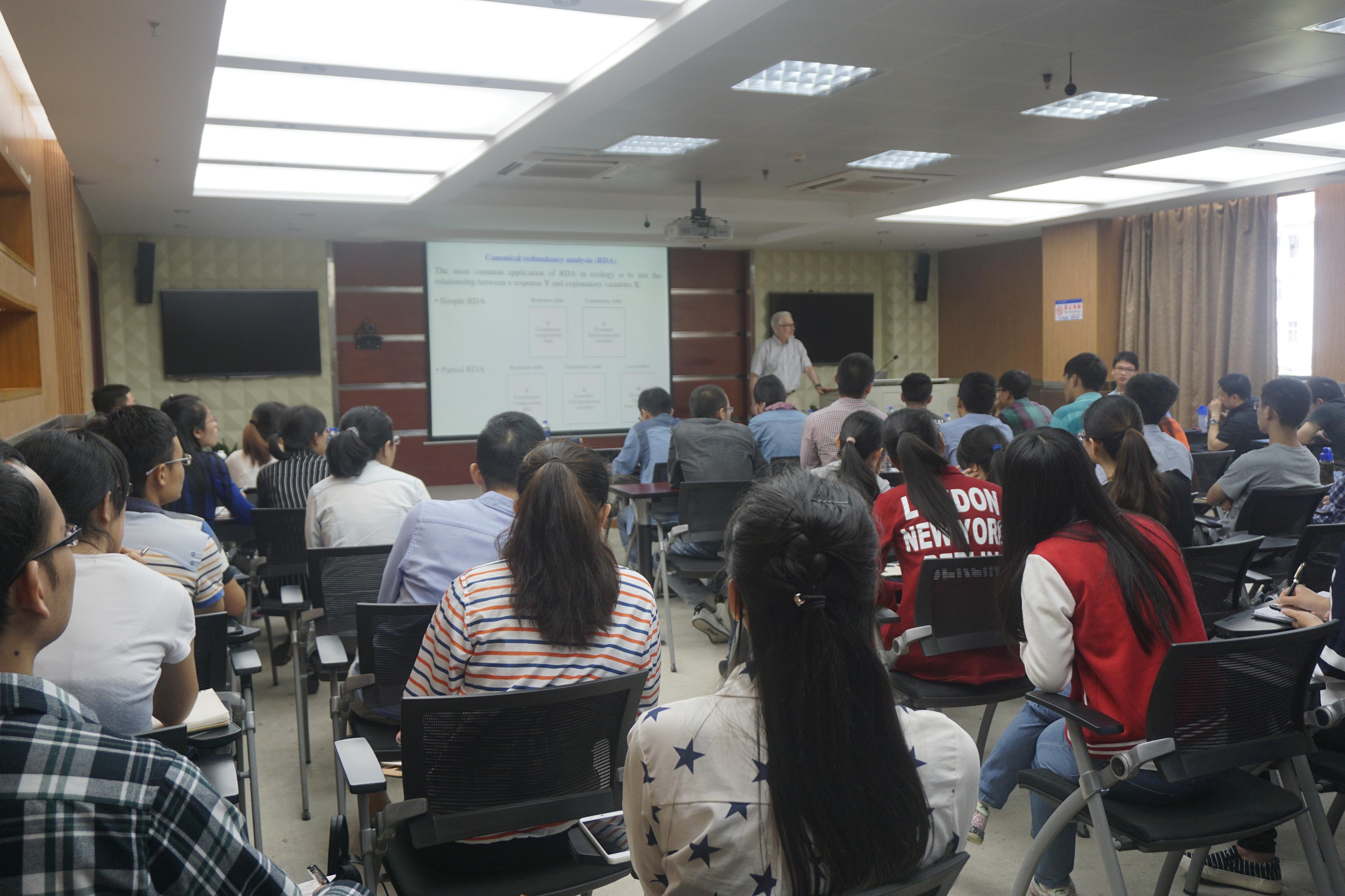 5月17日上午,在环境与生态学院A239报告厅,Legendre教授为全院师生带来了题为“Community surveys through space and time: testing the space-time interaction in the absence of replication”的精彩讲座。讲座伊始,受李庆顺院长的委托,朱旭东副教授对Legendre教授进行了简单的介绍,并代表学院对Legendre教授的来访表示热烈欢迎和感谢。随后,Legendre教授以如何利用统计学的方法来检验生态学野外调查采样中存在的时空交互作用为主题,结合涉及的生态学和统计学原理和方法,为我院师生进行了详细的介绍。他首先指出生态学野外调查研究普遍缺乏重复采样,不适合使用经典统计学方法进行统计分析,然后介绍了由他发展的一种适用于缺乏重复采样情况下的统计方法,接着他通过两个经典的实例来阐述了该方法的具体应用情况。在90分钟的讲座中,尽管是全英文交流,但同学们都非常认真的听讲,也受到很大的启发,讲座后同学们也提出了很多问题,Legendre教授都耐心地回答了每一个问题。最后,全体师生再次以热烈的掌声向Legendre教授的精彩演讲表示了感谢。