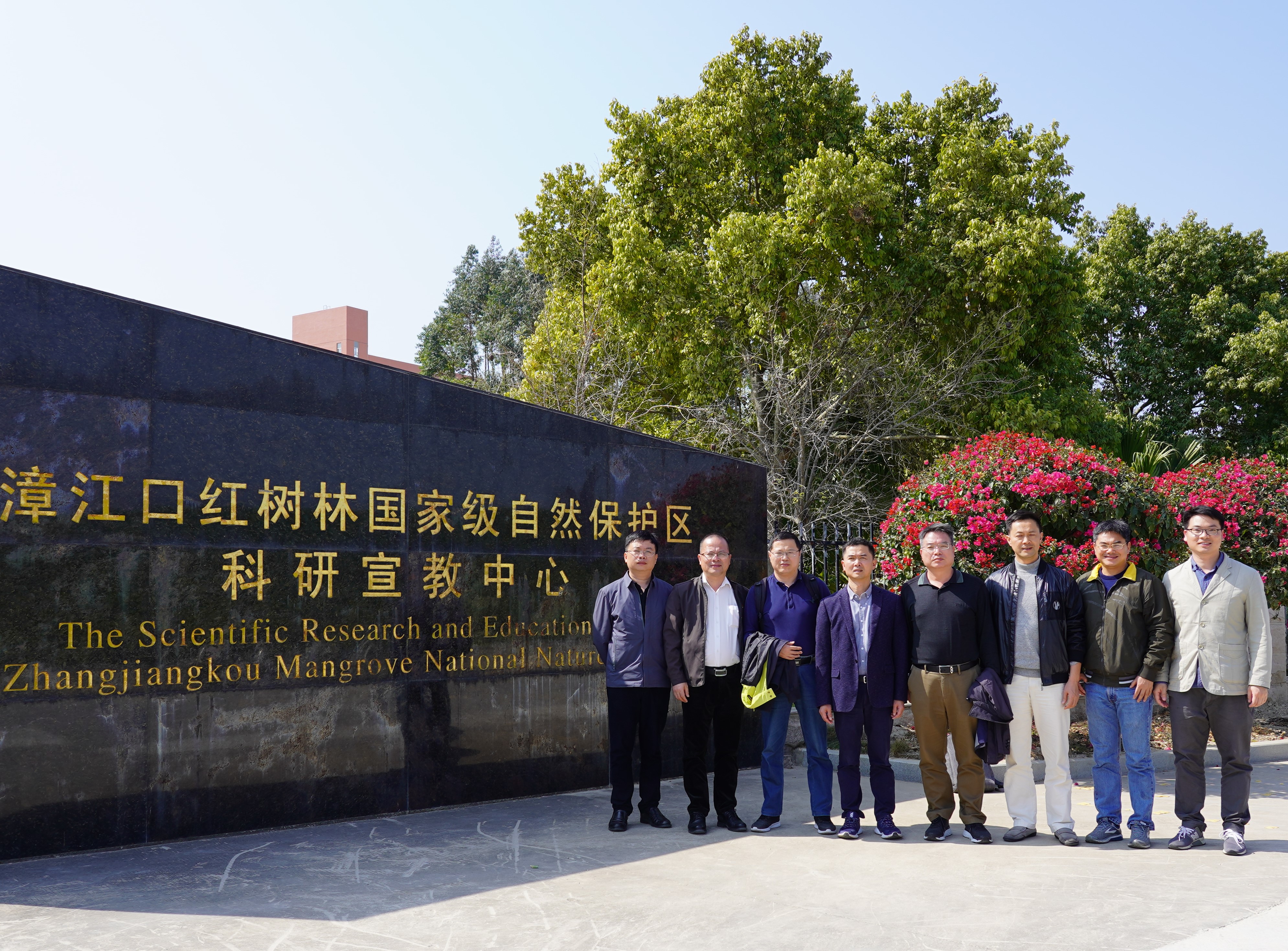 张明智一行首先来到漳江口实验场所在的漳江口红树林保护区,与保护区管理局局长董勇贵、副局长方柏洲等进行座谈交流,感谢保护区长期以来对实验场的大力支持。张明智指出,2020年12月,我校获批建设台湾海峡海洋生态系统国家野外观测研究站(以下简称台海站),漳江口实验场作为其重要组成部分,肩负着更重的任务和使命。希望保护区一如既往地给予支持,同时,漳江口实验场将进一步发挥自身优势,深化与保护区的全方位合作交流,服务保护区的建设和发展。董勇贵感谢厦门大学在漳江口红树林保护区的建立和发展过程中做出的重要贡献,表示保护区将继续全力支持漳江口实验场的建设发展,期待双方在现有基础上,进一步优势互补,共同推进更多科研合作。王文卿从资料编制、专业实习、生态文明培训、监测服务,以及生态学会科普基地的合作共建等多方面提出了合作思路和建议。