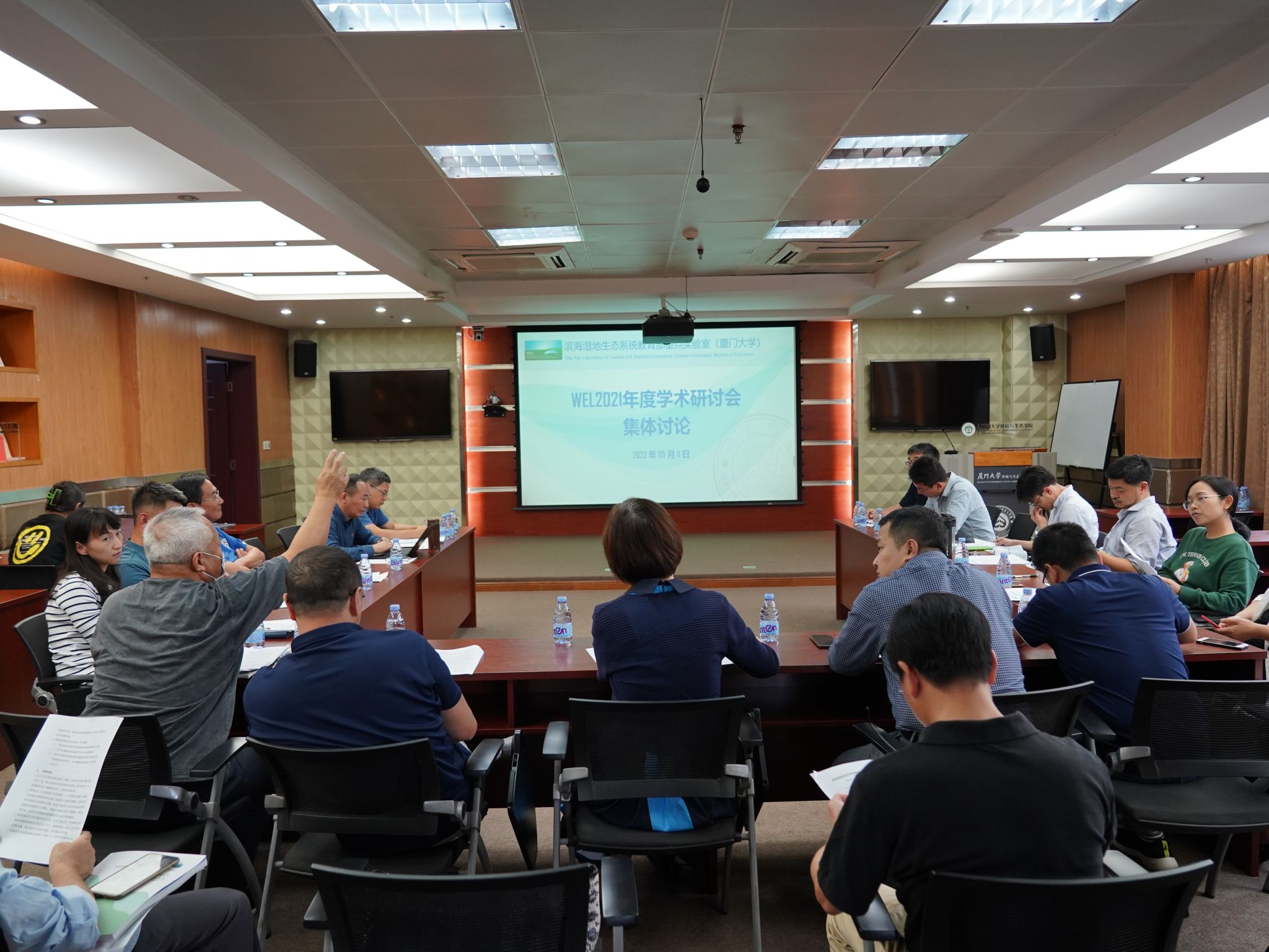 张宜辉作WEL2020-2021年度工作进展报告,王文卿、林晓凤以及新加盟成员叶文、郭峰、于鑫和王佩分别作研究进展报告,李庆顺、田蕴、卢豪良和黄晓佳分别就承担的WEL自主课题作年度进展报告。集中研讨环节,WEL全体成员围绕科学研究与队伍建设、开放交流与运行管理,以及人才培养与公众教育几个主题,对WEL新一轮建设期工作方案进行讨论。沈英嘉、卢豪良和谢敏伟特别介绍“滨海湿地生态系统与全球变化学科创新引智基地”建设、“自主创新示范区协同创新平台项目”申报和“生态与环境讲坛专家库”建设等方面工作。