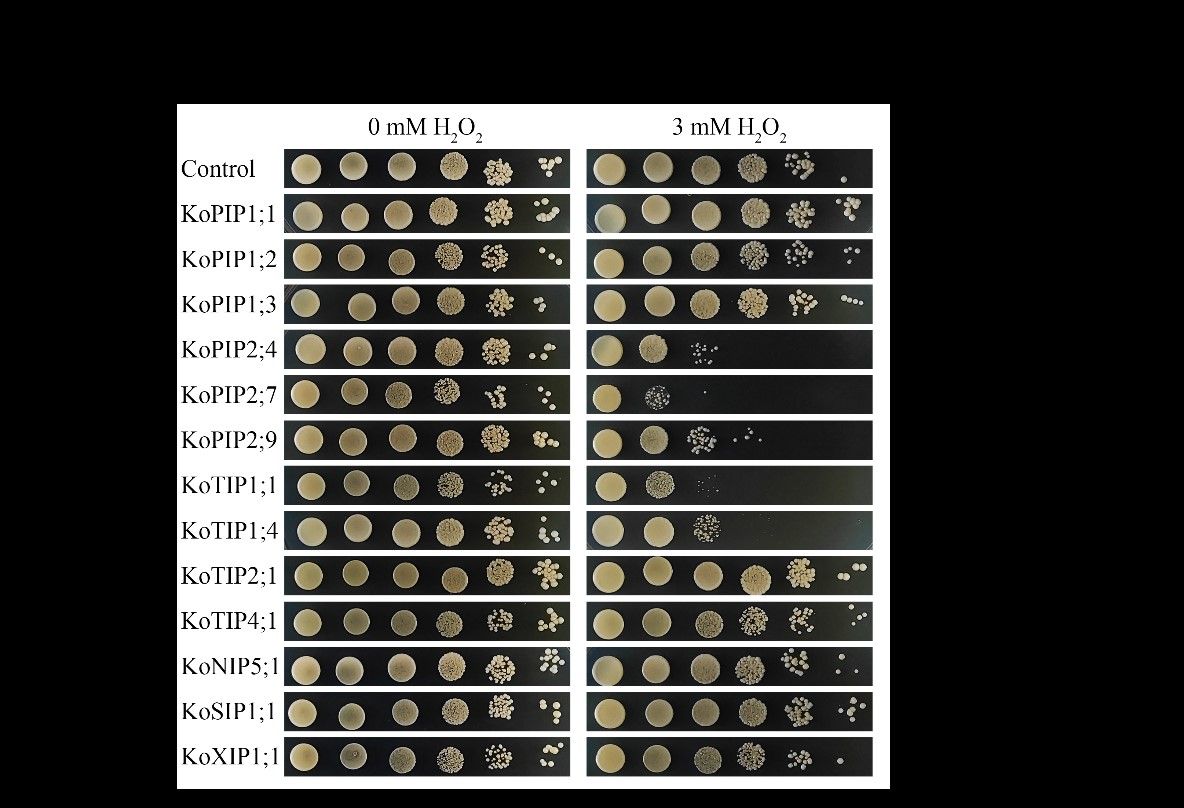 图2:在含H 2O2的培养基上表达KoAQP基因的酵母细胞的毒性生长测定