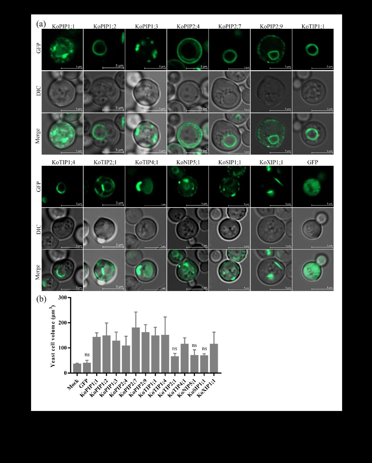 图1:KoAQPs的亚细胞定位和KoAQPs转运水的功能