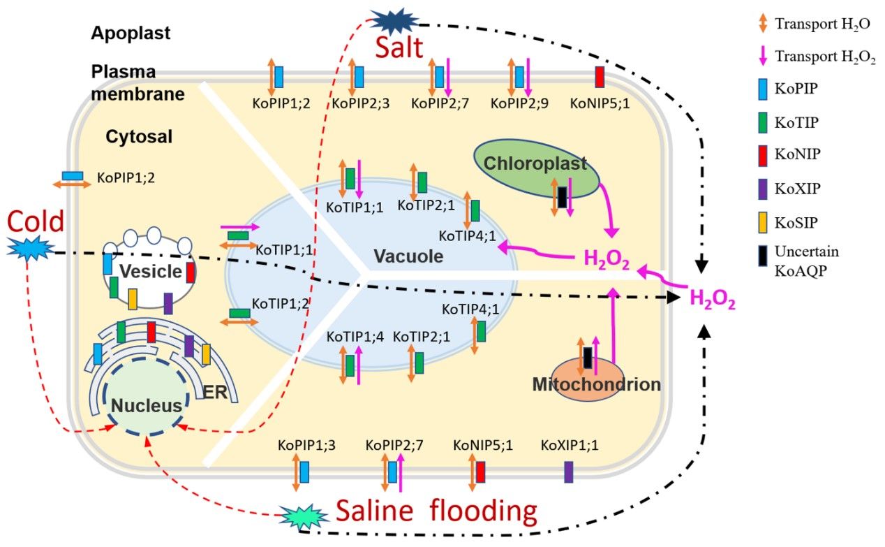 通常植物在受到胁迫后细胞中会积累过量的H2O2,红树植物秋茄在经历盐、水淹和冷刺激后,也会导致叶绿体、线粒体、细胞质和质外产生过量的H2O2,同时这些环境胁迫也会导致一些KoAQPs的表达量上升,其中一些表达量上升的水通道蛋白可以将过量的H2O2运输到液泡中降解,最终减少胁迫造成的损伤。