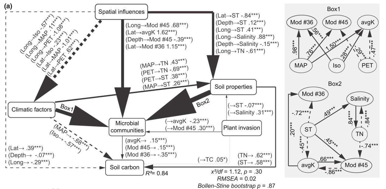 (4)本研究从微生物生态网络中鉴定了7个重要的生态模块,解析了生态网络复杂性、模块相对丰度与土壤碳库的关系(图3)。综上,土壤总碳主要受非生物因子调控,同时也受微生物组(包括模块#36、模块#45等)和网络复杂性的影响,而互花米草入侵则弱化了微生物组与总碳之间的强耦合关系。