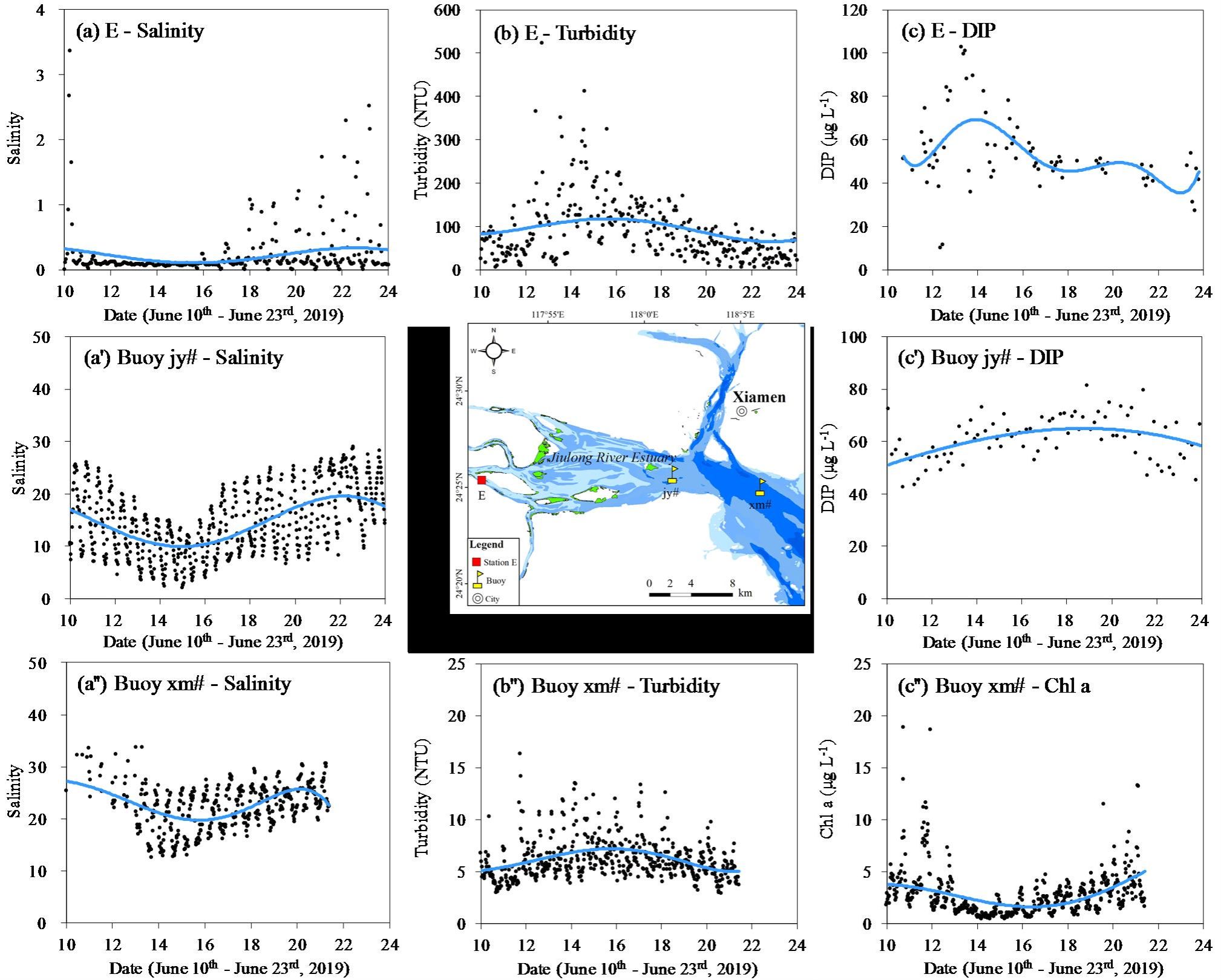 本研究于2019年6月在亚热带河流九龙江流域北溪与西溪出口、河口最大浑浊带分别设置定点观测站位,结合布放在九龙江口(鸡屿)和厦门湾南部海域两个浮标的观测资料,完整捕捉到一场洪水过程(初始、涨水、退水和结束四个阶段,历时14天)流量和营养盐等多个参数的脉冲信号。基于过程分析与关键界面通量计算,研究了河流-河口系统氮和磷的来源、转化与输出。研究发现: