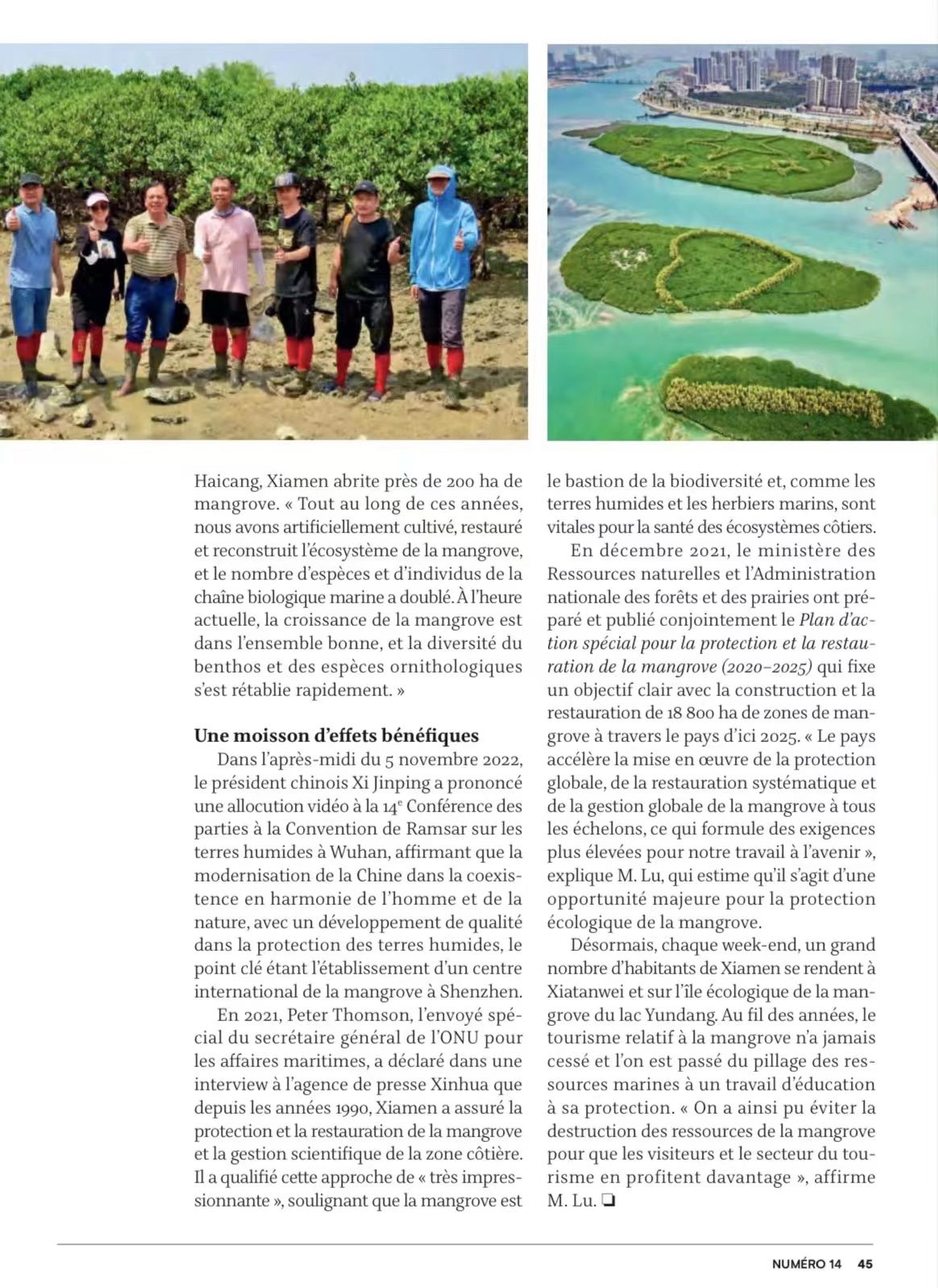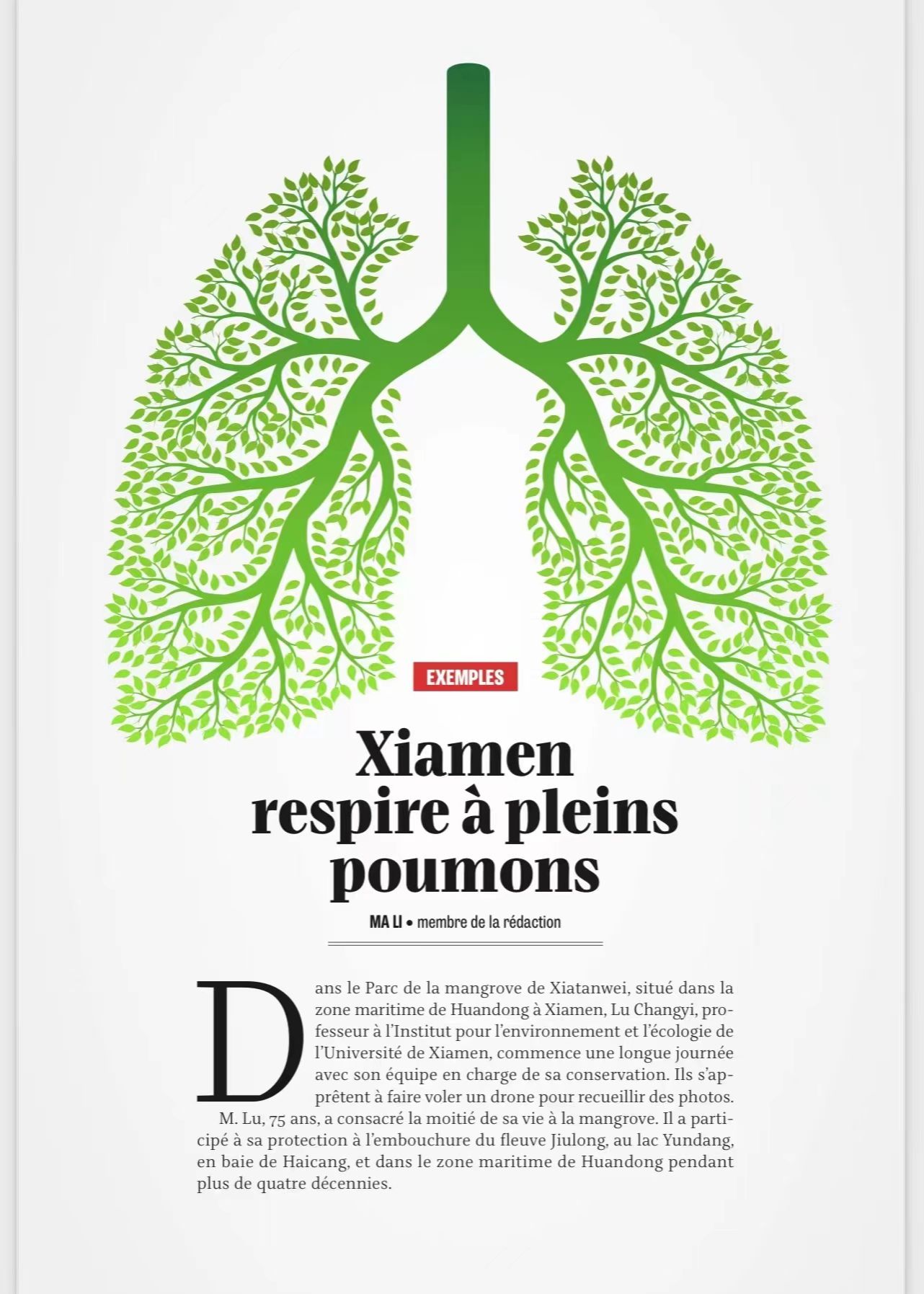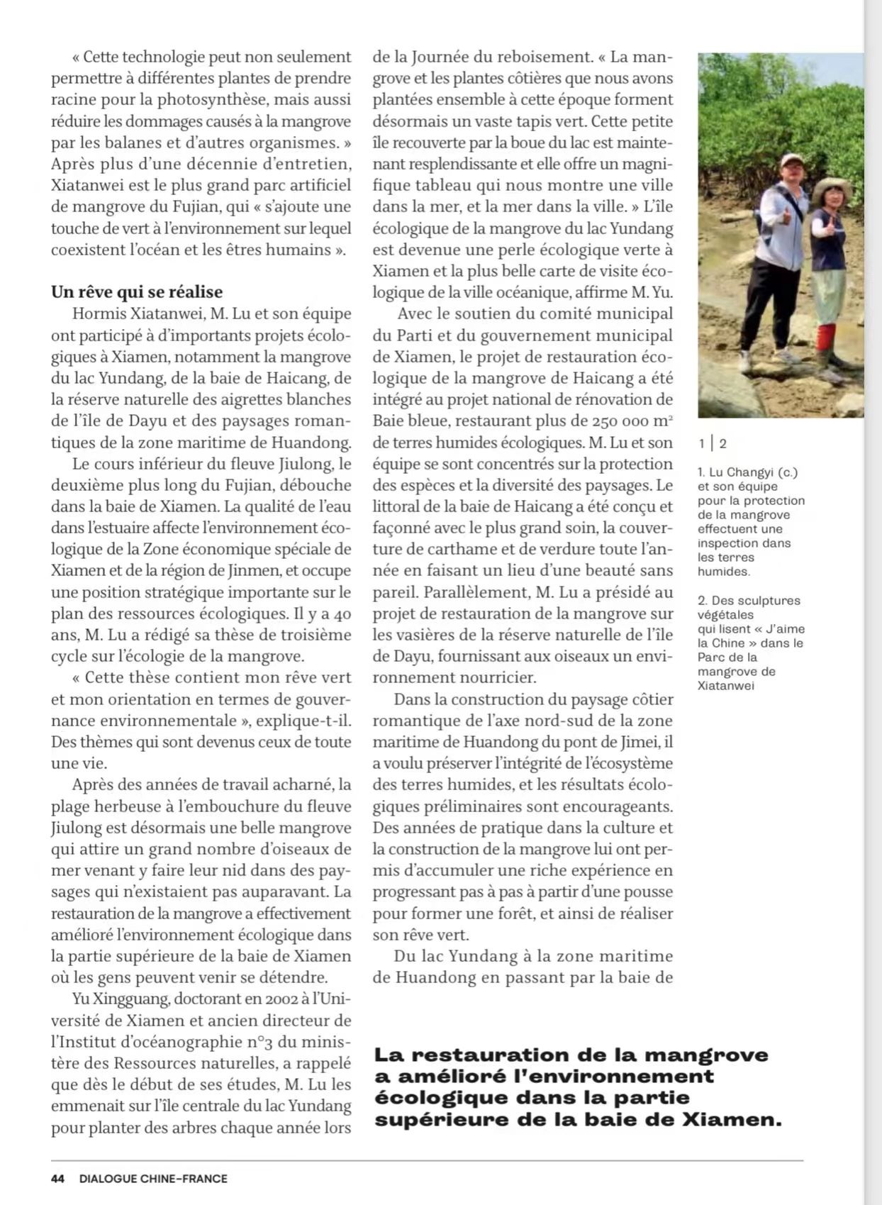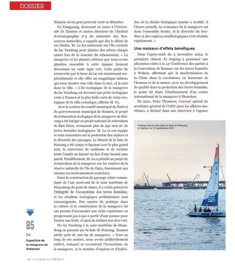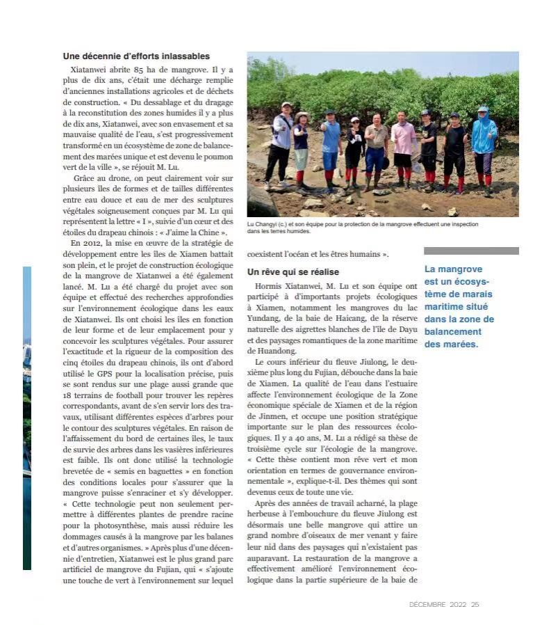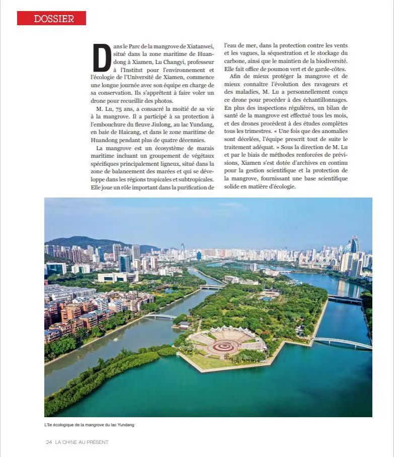 近日,《今日中国》(法文版)与《中法对话》杂志刊发题为“Xiamen respire à pleins poumons”的专题报道,以厦门环东海域下潭尾红树林公园建设为典型案例,向世界宣传展示厦门红树林生态修复的显著成效,展现了我国海洋生态文明建设的风采。文中重点介绍了我室、环境与生态学院卢昌义教授团队在下潭尾红树林湿地公园建设项目中开展的红树林恢复工作,将下潭尾逐步改造为蓝色海湾上的“城市绿肺”;由卢昌义教授团队设计打造的全国独一无二的“我爱中国”地标景观,把厦门大学师生和厦门人民热爱祖国的情怀融入红树林的生态建设中去,也使下潭尾成为厦门一张新的生态名片。